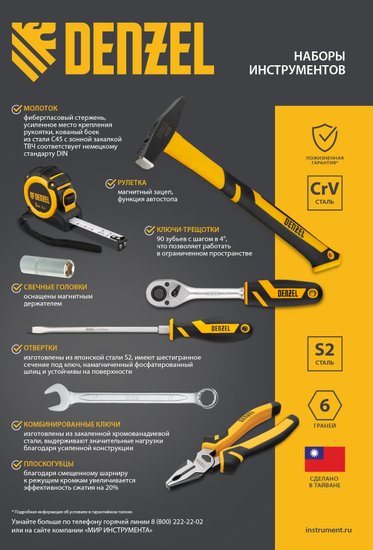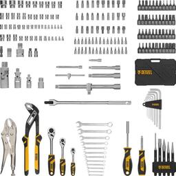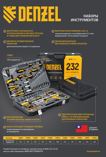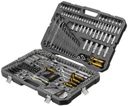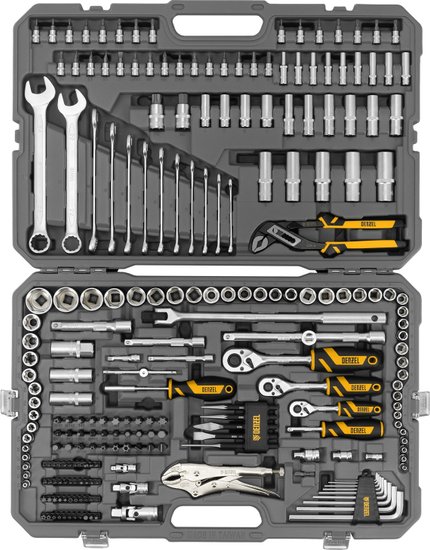 • Комплектация Ключ-трещотка 1/4", 3/8", 1/2" 3 шт Вороток шарнирный 1/2": 380 мм 1 шт Вороток Т-образный 1/4": 115 мм 1 шт Удлинители 1/4": 50, 100 мм 2 шт Удлинитель 3/8": 125 мм 1 шт Удлинители 1/2": 125, 250 мм 2 шт Переходник для бит 1/4"-1/4" 1 шт Переходник для бит 3/8"-5/16" 1 шт Переходник для бит 1/2"-5/16" 1 шт Кардан: 1/4", 3/8", 1/2" 3 шт Кернер: 120 мм 1 шт Бородок: 120 мм 1 шт Крейцмейсель: 130 мм 1 шт Зубило: 130 мм 1 шт Выколотка: 150 мм 1 шт Клещи переставные: 250 мм 1 шт Отвертка-держатель 2К-рукоятка 1/4": 150 мм 1 шт Отвертка для бит 2К-рукоятка 1/4": 200 мм 1 шт Зажим с фиксатором: 180 мм 1 шт Головки свечные магнитные 3 шт Головки торцевые удлиненные 1/4" 13 шт Головки торцевые удлиненные 3/8" 6 шт Головки торцевые удлиненные 1/2" 5 шт 3-сторонний адаптер 3/8"-1/2" 1 шт Адаптер с шестигранника на квадрат 1/4"-1/4" 1 шт Ключи комбинированные 12 шт Головки торцевые 1/4" 13 шт Головки торцевые 3/8" 10 шт Головки торцевые 1/2" 14 шт Биты с головками 1/4" 29 шт Ключи имбусовые 9 шт Биты-вставки 5/16", 30 мм 30 шт Биты-вставки 1/4", 25 мм 44 шт Биты с головками 1/2" 2 шт Пластиковый кейс 1 шт