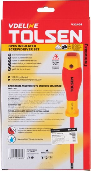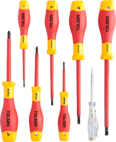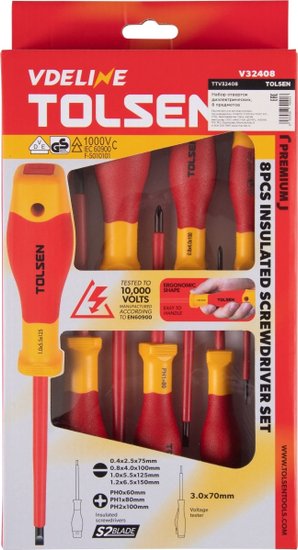 - Комплектация Отвёртки диэлектрические PHILLIPS – PH0×60, PH1×80, PH2×100 мм; SLOTTED – SL2.5×0.4×75, SL4.0×0.8×100, SL5.5×1.0×125, SL6.5×1.2×150 мм; Тестер-отвёртка для проверки напряжения 125-250В – SLOTTED SL3.0×70 мм