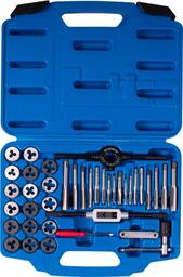 - Комплектация Метчики: M3x0.5, M3x0.6, M4x0.7, M4x0.75, M5x0.8, M5x0.9, M6x0.75, M6x1.0, M7x0.75, M7x1.0, M8x1.0, M8x1.25, M10x1.25, M10x1.5, M12x1.5, M12x1.75, 1/8NPT27; Плашки Ø 25 мм: M3x0.5, M3x0.6, M4x0.7, M4x0.75, M5x0.8, M5x0.9, M6x0.75, M6x1.0, M7x0.75, M7x1.0, M8x1.0, M8x1.25, M10x1.25, M10x1.5, M12x1.5, M12x1.75, 1/8NPT27; Метчикодержатель Т-типа: М3-М12; Метчикодержатель цанговый: М3-М6; Плашкодержатель: Ø 25 мм; Отвёртка: 3.0 x 45 мм; Резьбомер веерный: 0.5, 0.6, 0.7, 0.75, 0.8, 0.9, 1.0, 1.25, 1.5, 1.75, 27 NPT, 28 NPT