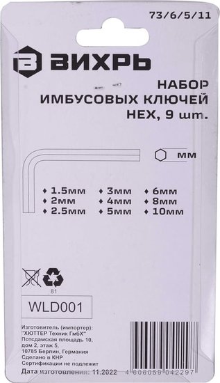 • Комплектация 1,5 мм, 2 мм, 2,5 мм, 3 мм, 4 мм, 5 мм, 6 мм, 8 мм, 10 мм.