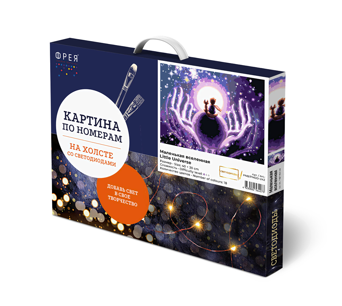 - Комплектация набора холст, гирлянда, краски, кисти (3 шт.), крепление, инструкция, контрольный лист