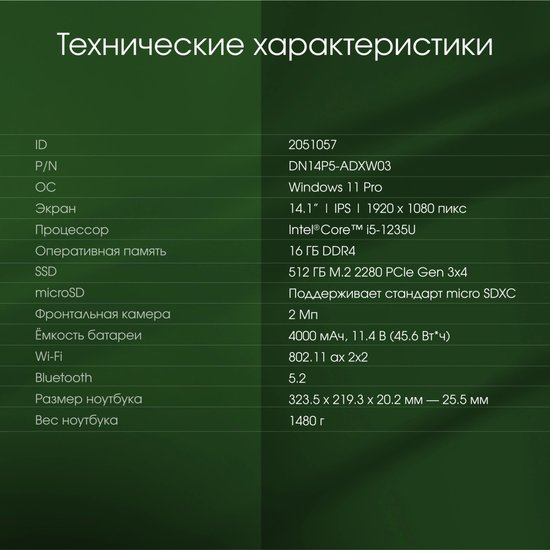 ❗️Текст описания составлен при помощи искусственного интеллекта.✅ Ноутбук Digma Pro Fortis M DN14P5-ADXW03 — это идеальный выбор для тех, кто ищет мощное и компактное устройство для работы и развлечений. С диагональю экрана 14.1 дюйма и разрешением 1920 x 1080, он обеспечивает яркое и четкое изображение, что делает его отличным вариантом для просмотра фильмов и работы с графикой.✅ Оснащенный процессором Intel Core i5 1235U и 16 ГБ оперативной памяти, этот ноутбук справляется с многозадачностью и позволяет запускать ресурсоемкие приложения без задержек. Благодаря 12 потокам и 10 ядрам, вы сможете легко выполнять несколько задач одновременно, что особенно важно для профессионалов и студентов.✅ Ноутбук также предлагает 512 ГБ SSD, что обеспечивает быструю загрузку системы и приложений. Вы сможете хранить все необходимые файлы и документы, не беспокоясь о нехватке места. Кроме того, наличие слота для расширения памяти позволяет увеличить объем хранилища при необходимости.⚠️ Если вы ищете надежное устройство для работы, учебы или развлечений, Digma Pro Fortis M DN14P5-ADXW03 станет отличным выбором. Его легкий вес (1480 г) и компактные размеры делают его удобным для переноски, что идеально подходит для активных пользователей.✅ Матовый экран с технологией IPS обеспечивает комфортный просмотр при любом освещении, а поддержка карт памяти microSD позволяет легко расширять функциональность устройства. Этот ноутбук сочетает в себе стильный дизайн и высокую производительность, что делает его идеальным спутником в повседневной жизни.❗️Текст описания составлен при помощи искусственного интеллекта.✅ Ноутбук Digma Pro Fortis M DN14P5-ADXW03 — это идеальный выбор для тех, кто ищет мощное и компактное устройство для работы и развлечений. С диагональю экрана 14.1 дюйма и разрешением 1920 x 1080, он обеспечивает яркое и четкое изображение, что делает его отличным вариантом для просмотра фильмов и работы с графикой.✅ Оснащенный процессором Intel Core i5 1235U и 16 ГБ оперативной памяти, этот ноутбук справляется с многозадачностью и позволяет запускать ресурсоемкие приложения без задержек. Благодаря 12 потокам и 10 ядрам, вы сможете легко выполнять несколько задач одновременно, что особенно важно для профессионалов и студентов.✅ Ноутбук также предлагает 512 ГБ SSD, что обеспечивает быструю загрузку системы и приложений. Вы сможете хранить все необходимые файлы и документы, не беспокоясь о нехватке места. Кроме того, наличие слота для расширения памяти позволяет увеличить объем хранилища при необходимости.⚠️ Если вы ищете надежное устройство для работы, учебы или развлечений, Digma Pro Fortis M DN14P5-ADXW03 станет отличным выбором. Его легкий вес (1480 г) и компактные размеры делают его удобным для переноски, что идеально подходит для активных пользователей.✅ Матовый экран с технологией IPS обеспечивает комфортный просмотр при любом освещении, а поддержка карт памяти microSD позволяет легко расширять функциональность устройства. Этот ноутбук сочетает в себе стильный дизайн и высокую производительность, что делает его идеальным спутником в повседневной жизни.