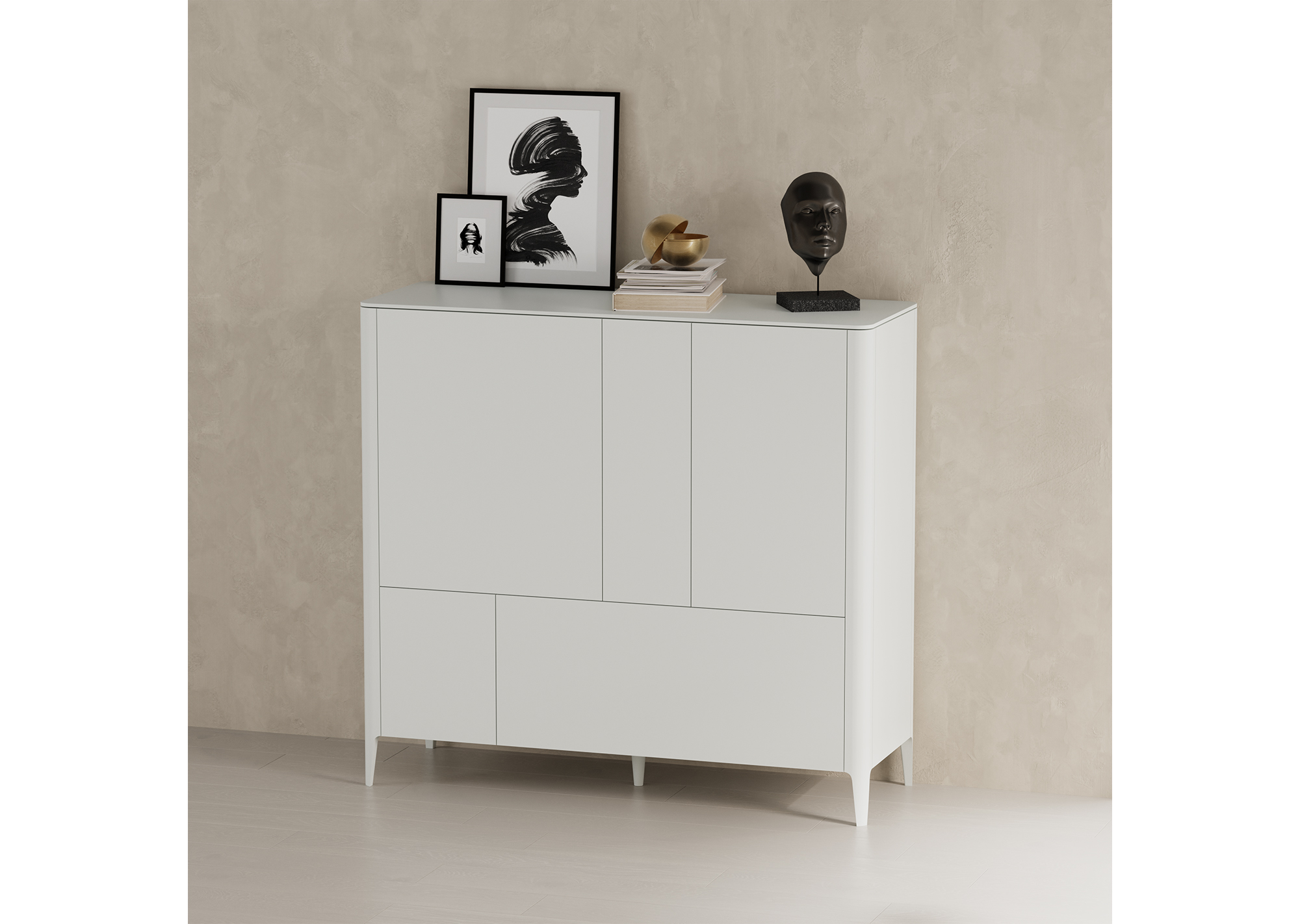 Высота: 135 см Ширина:145 см Глубина: 51 см Покрытие эмаль, RAL 7035 Материал: бук, мдф, внутри лдсп