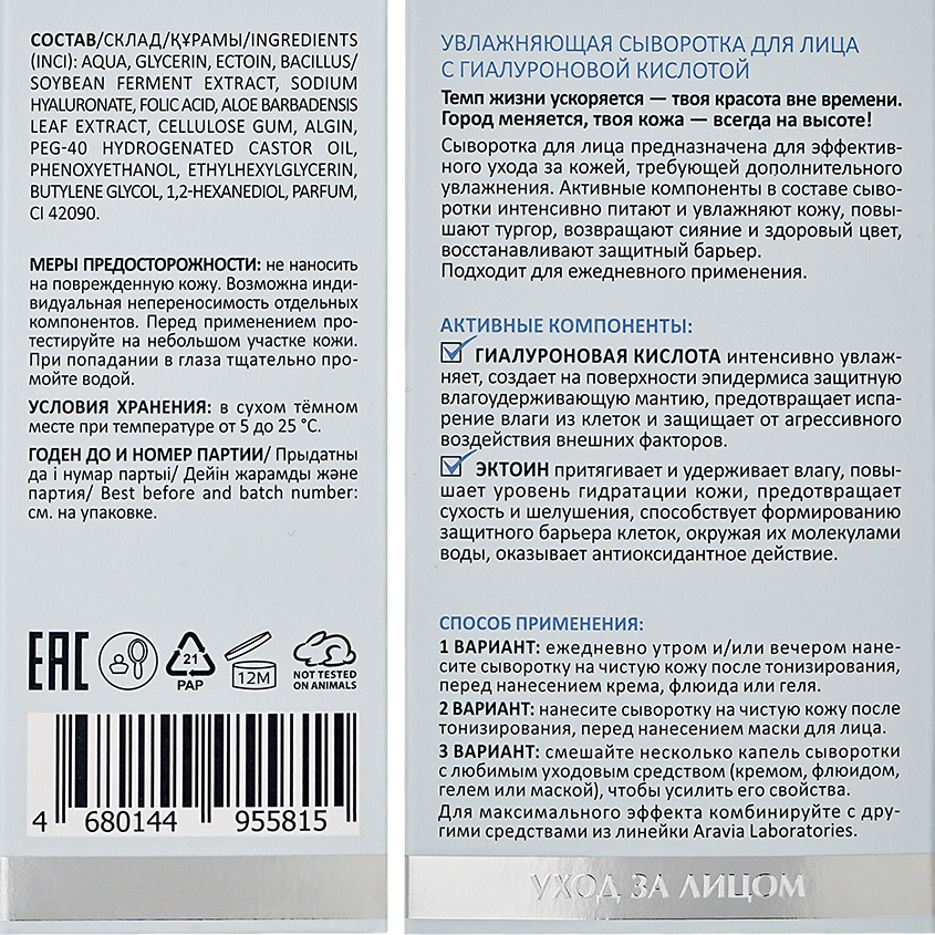Сыворотка для лица `ARAVIA` `LABORATORIES` Hydra Therapy увлажняющая с гиалуроновой кислотой 50 мл