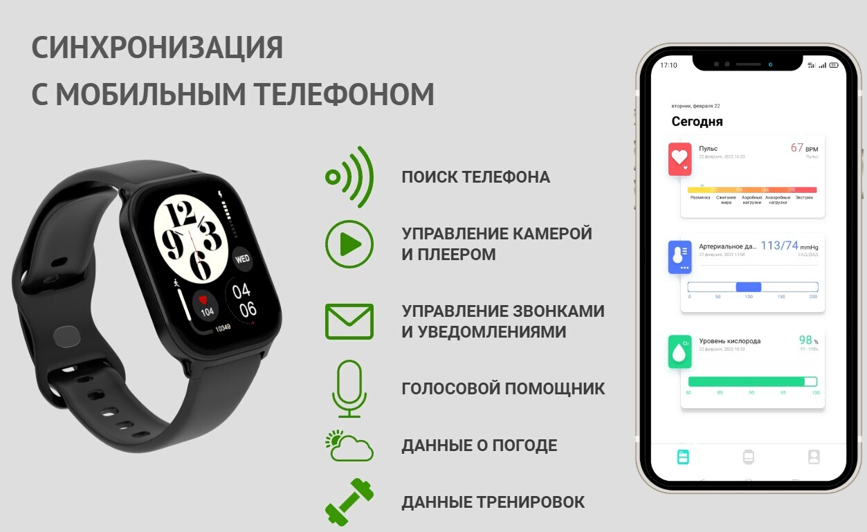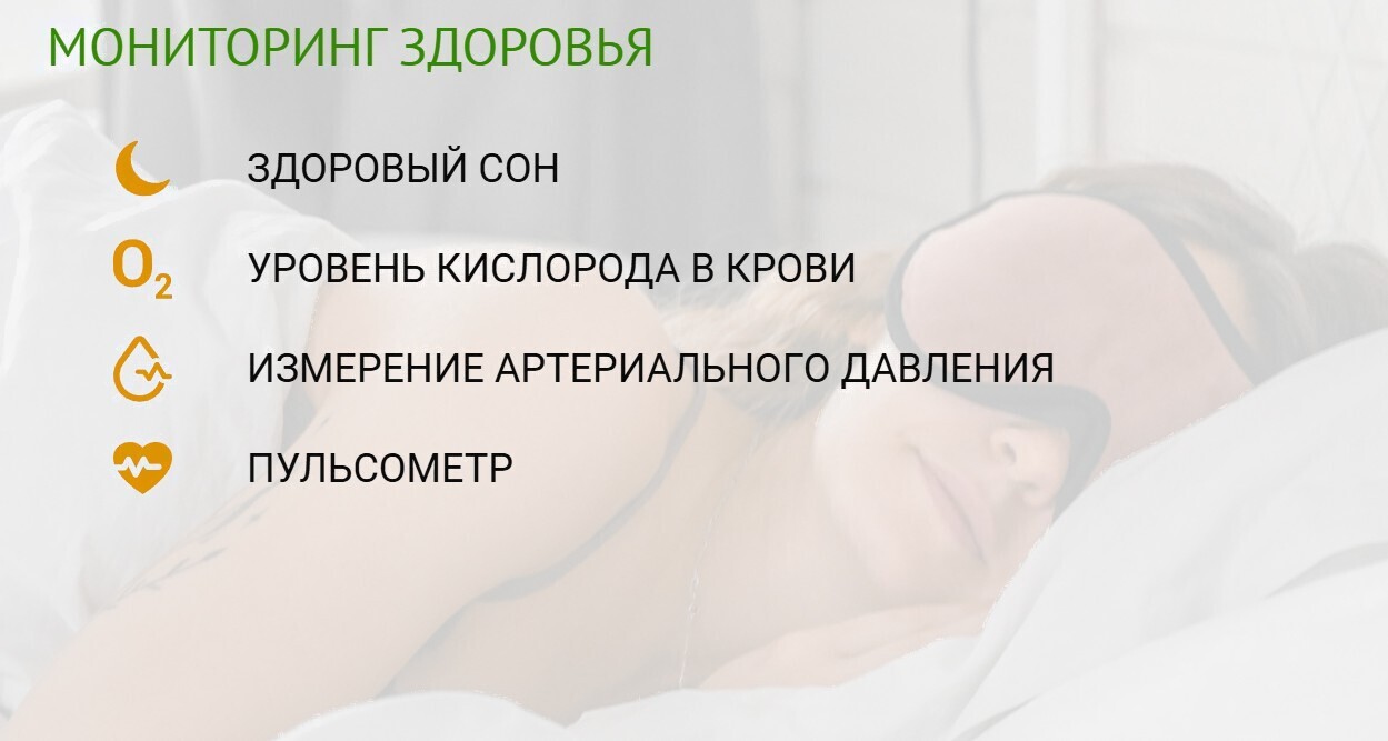 • Здоровье мониторинг сна, мониторинг уровня кислорода в крови, мониторинг давления, мониторинг пульса, мониторинг физической активности, дыхательные упражнения