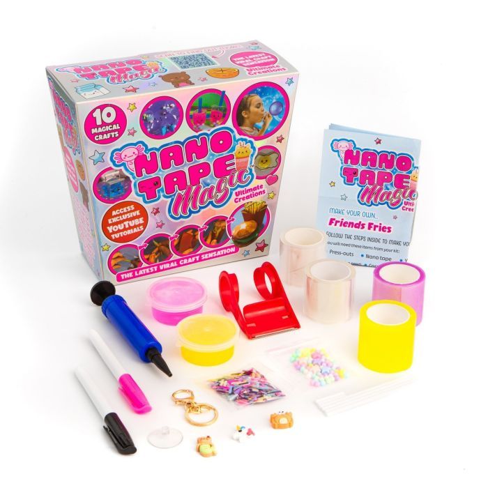 • Комплектація прозора Nano tape 2 ролики; рожева Nano tape 1 ролик; жовтий Nano tape 1 ролик; утримувач для Nano tape; чорний фломастер; рожевий фломастер; рожевий слайм; жовтий слайм; перфоровані форми; фурнітура для брелока 1 шт.; присоска 1 шт.; насос; конфетті напо