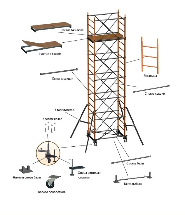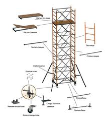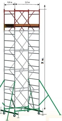 Вышка сборно-разборная передвижная (далее вышка) предназначена для проведения строительно-монтажных, отделочных и ремонтных работ как внутри помещения так и снаружи. Устойчивая, с удобной рабочей площадкой.Идеальное сочетание цены и качества.Вышка комплектуется надежными, большегрузными, поворотными, обрезиненными колесами с тормозом SCdb63 и без тормоза ( диаметр150мм, нагрузка 230кг) .Рабочий настил вышки представляет собой металлический каркас с фанерой толщиной 12 мм.2. Технические характеристики. • Диаметр трубы, мм: 42 • Размер рабочей площадки, м: 2,0 х 0,9 (две части настила) • Размеры лестницы (высота х ширина), м: 1,2 х 0,9 • Распределенная нагрузка на настил, кгс/м2: 250 • Статическая нагрузка на перила, кг: 70 • Высота (по ограждению), м: 7,4• Высота (по настилу), м: 6,2 • Вес, кг: 200• Количество секций: 5+1* * Обращаем Ваше внимание! В накладной к вышке «Радиан» одна секция включена в комплект базового