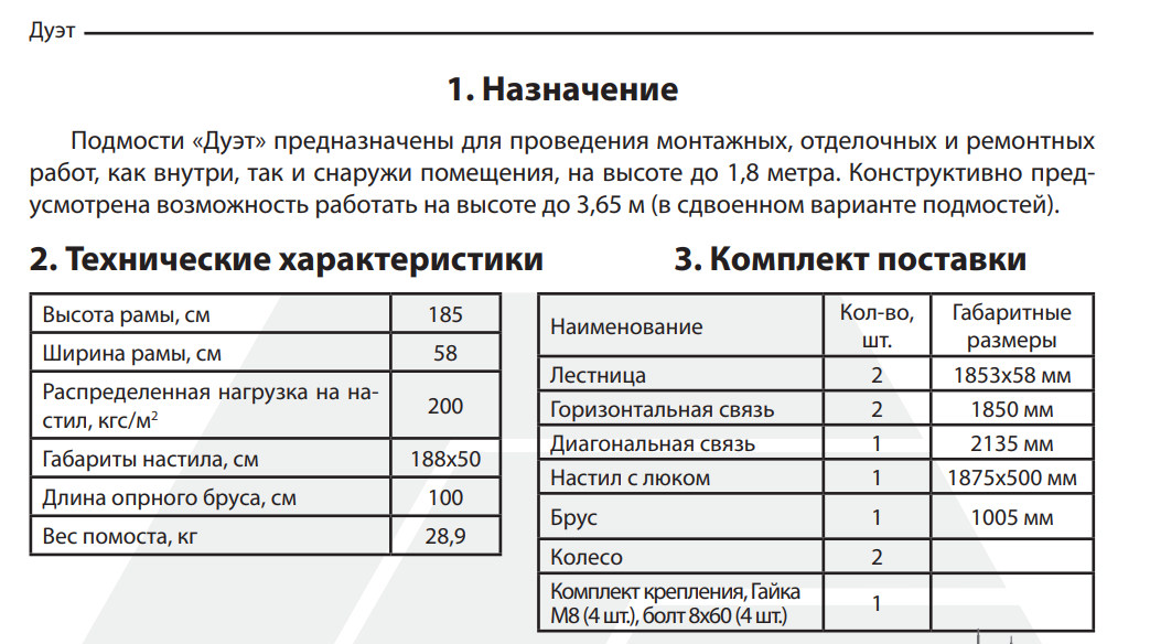 Подмости «Дуэт» предназначены для проведения монтажных, отделочных и ремонтных работ, как внутри, так и снаружи помещения, на высоте до 1.8 метра. Конструктивно предусмотрена возможность работать на высоте до 3.6 м (в сдвоенном варианте подмостей). Подмости из стальной трубы диаметром 25 мм.