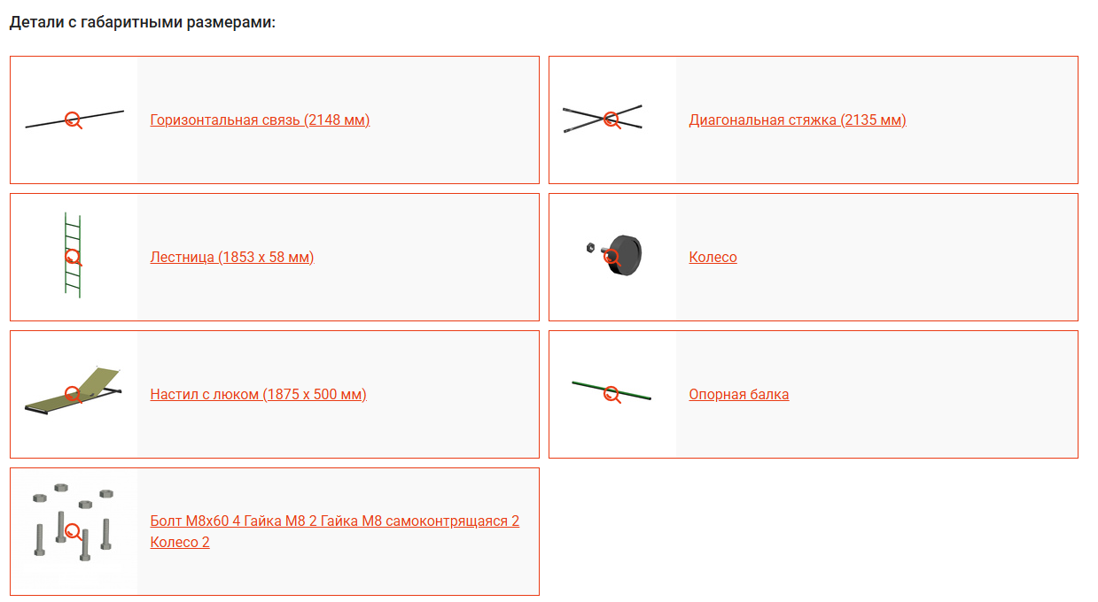 подмости укомплектованы двумя колесами (полиэтилен низкого давления) и стабилизатором;