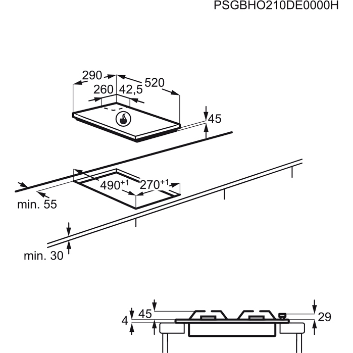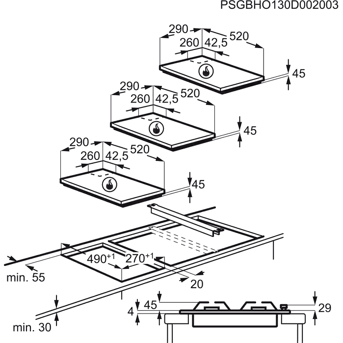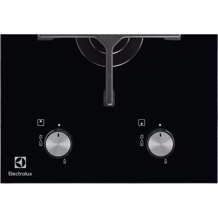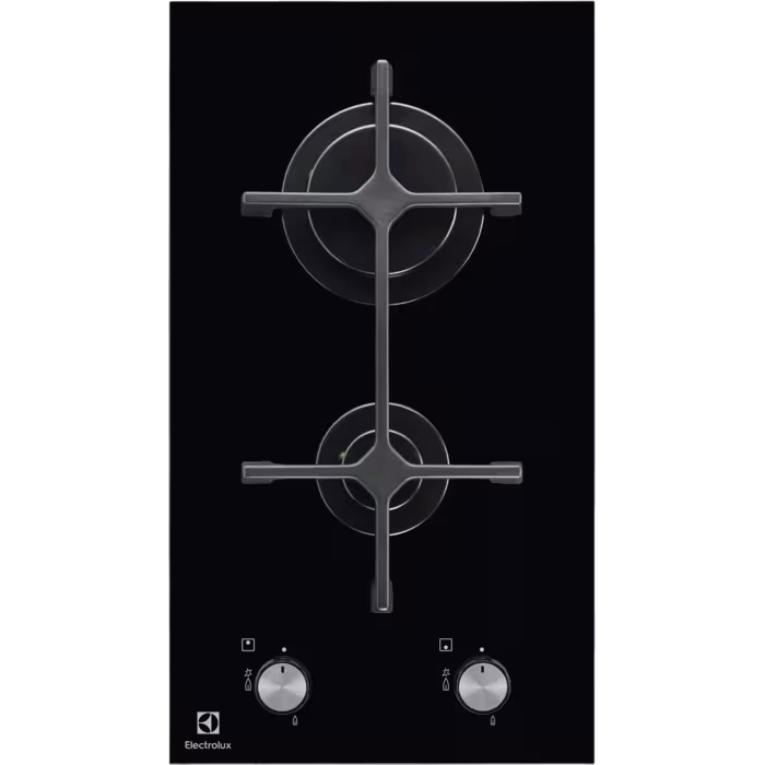 Домино ELECTROLUX/ газовая поверхность на 2 конфорки, закаленное стекло, мощность: 3900 Вт, автоматический электроподжиг, газ-контроль, решетки: чугун, независимая установка, размеры (ШхГ): 29x52 см