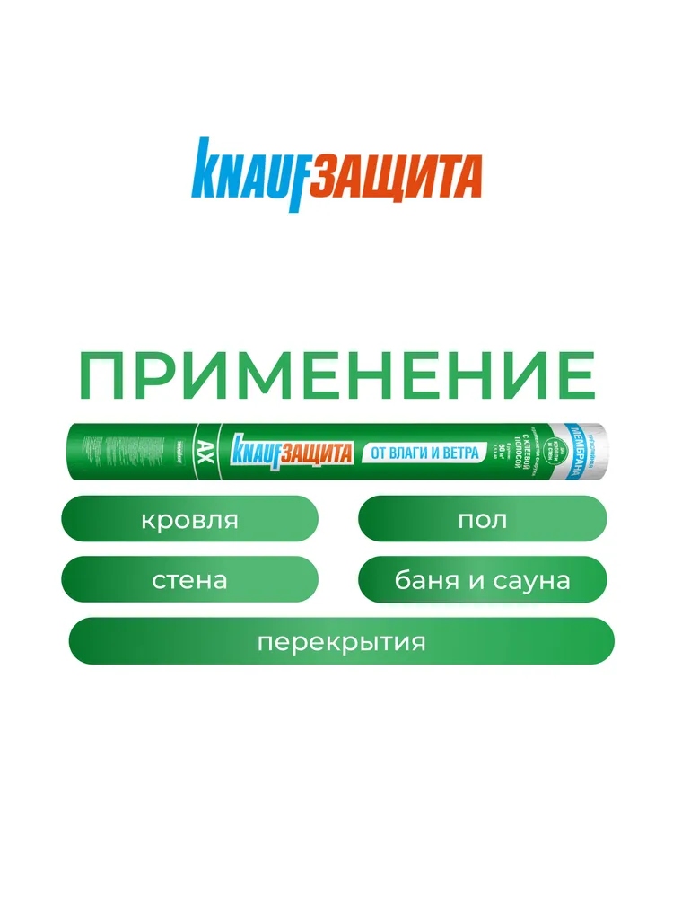 KNAUF Защита от ВЛАГИ и ВЕТРА — влаго- и ветрозащитная супердиффузионная мембрана экстра-класса. Это трехслойный материал повышенной прочности, состоящий из функционального микропористого водонепроницаемого слоя, скрепленного с двух сторон нетканым полипропиленовым полотном. Оснащена клеевой полосой для удобства и простоты монтажа. Устойчива к воздействию плесени, бактерий и УФ-излучению. Высокая паропроницаемость способствует выходу из строительных конструкций излишней влаги. Ограниченная воздухопроницаемость защищает утеплитель от конвективных потерь тепла. Мембрану можно монтировать на теплоизоляцию без вентиляционного зазора, таким образом снижается толщина кровли, что позволяет сэкономить при строительстве крыши.
