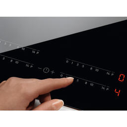 Панель управления сенсорная, с четырьмя слайдерами — по одному для каждой конфорки. Чтобы выбрать уровень мощности, нужно лишь провести пальцем до нужной отметки. Продолжительность приготовления можно установить, запрограммировав таймер. По истечении заданного времени панель автоматически выключится и оповестит Вас звуковым сигналом. Поддерживается функция «Эко»: приготовление на остаточном тепле, что позволяет экономить электроэнергию. Доступ к настройкам можно заблокировать — случайное нажатие не приведет к изменению параметров.
