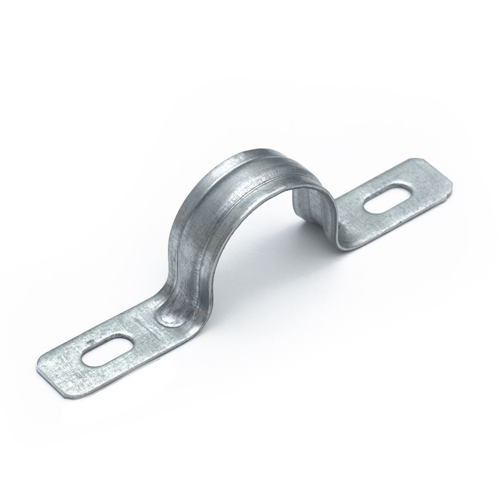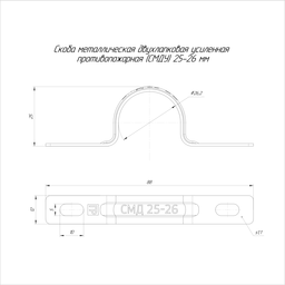 Скоба металлическая двухлапковая усиленная противопожарная (СМДУ), предназначена для крепления металлорукава, металлических и пластиковых труб к различным несущим поверхностям, а также для монтажа кабельной продукции. Изготавливается с овальным отверстиями 10х5мм (скобы диаметром от 6 до 40мм), и 10х6мм (скобы диаметром от 48-63мм), что обеспечивает возможность установки самореза с пресс-шайбой диаметром 4,2мм. Конструкция скоб соответствует ГОСТ 17678-80. Скобы металлические изготавливаются из оцинкованной стали (по ГОСТ 14918), толщиной от 0,9 до 1,9мм. Применяются в ОКЛ.