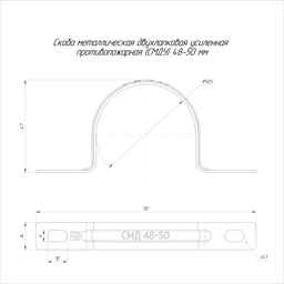 Скоба металлическая двухлапковая усиленная противопожарная (СМДУ), предназначена для крепления металлорукава, металлических и пластиковых труб к различным несущим поверхностям, а также для монтажа кабельной продукции. Изготавливается с овальным отверстиями 10х5мм (скобы диаметром от 6 до 40мм), и 10х6мм (скобы диаметром от 48-63мм), что обеспечивает возможность установки самореза с пресс-шайбой диаметром 4,2мм. Конструкция скоб соответствует ГОСТ 17678-80. Скобы металлические изготавливаются из оцинкованной стали (по ГОСТ 14918), толщиной от 0,9 до 1,9мм. Применяются в ОКЛ.