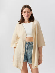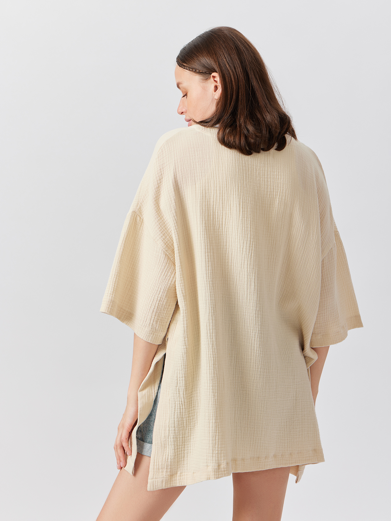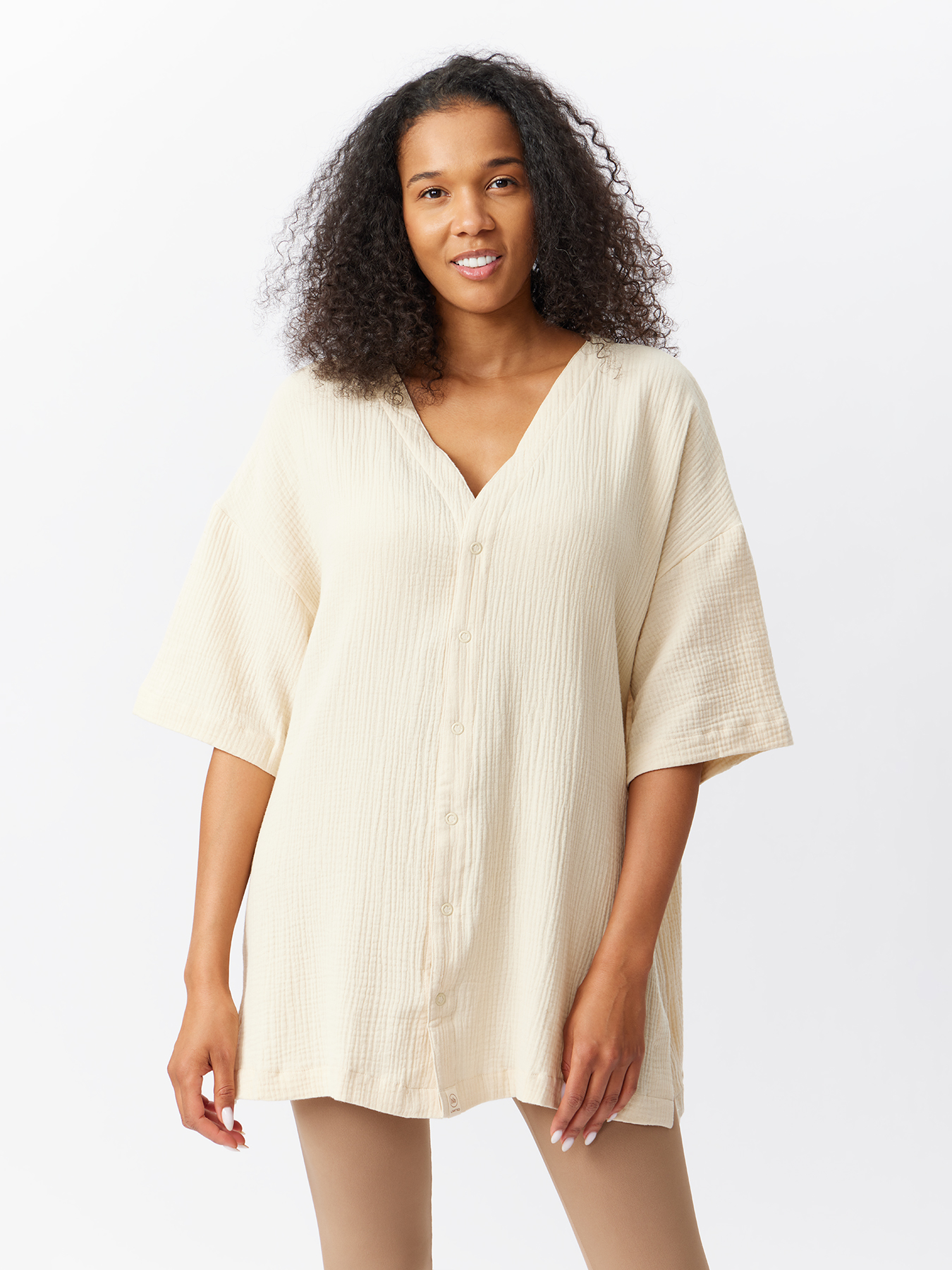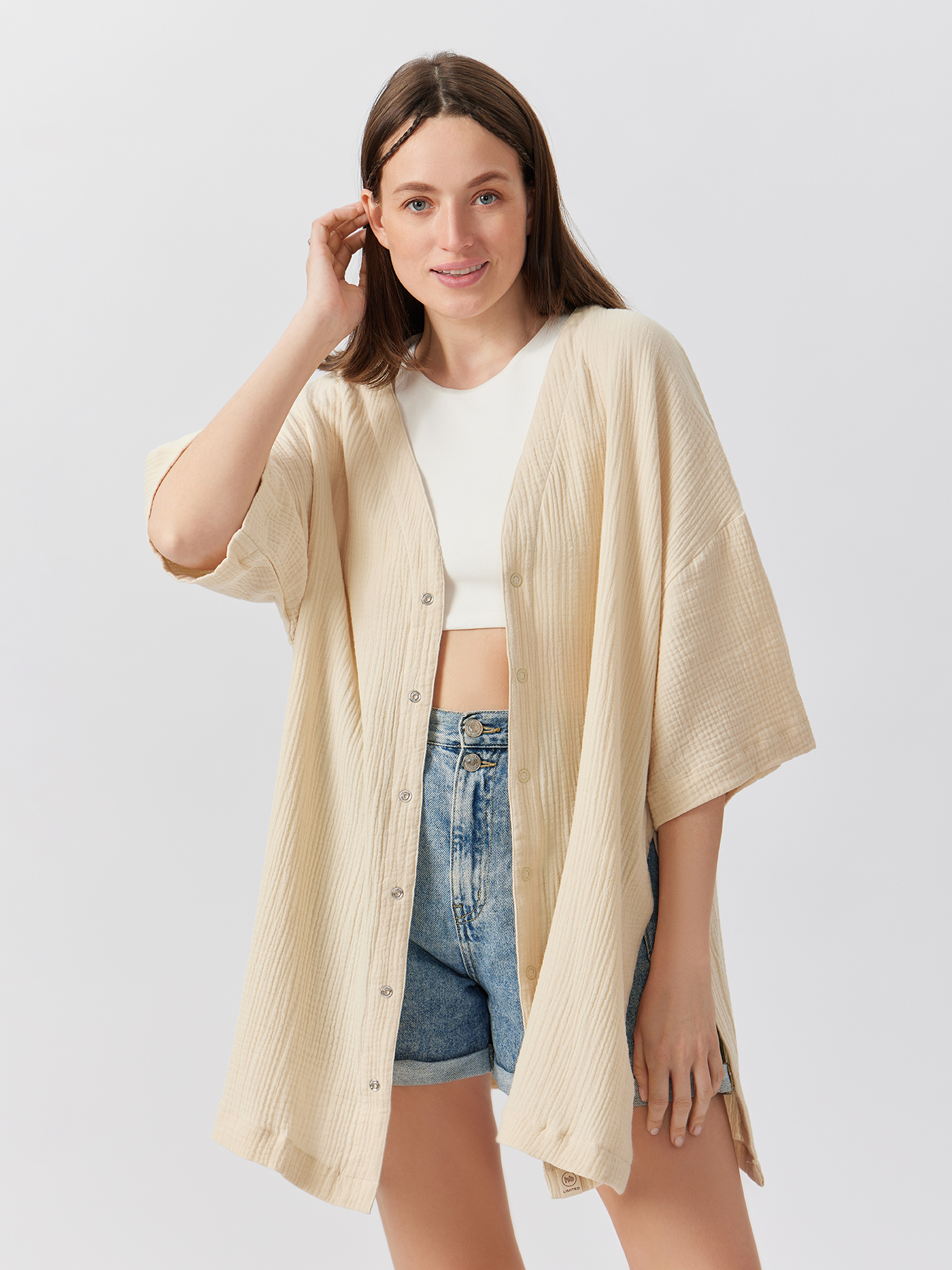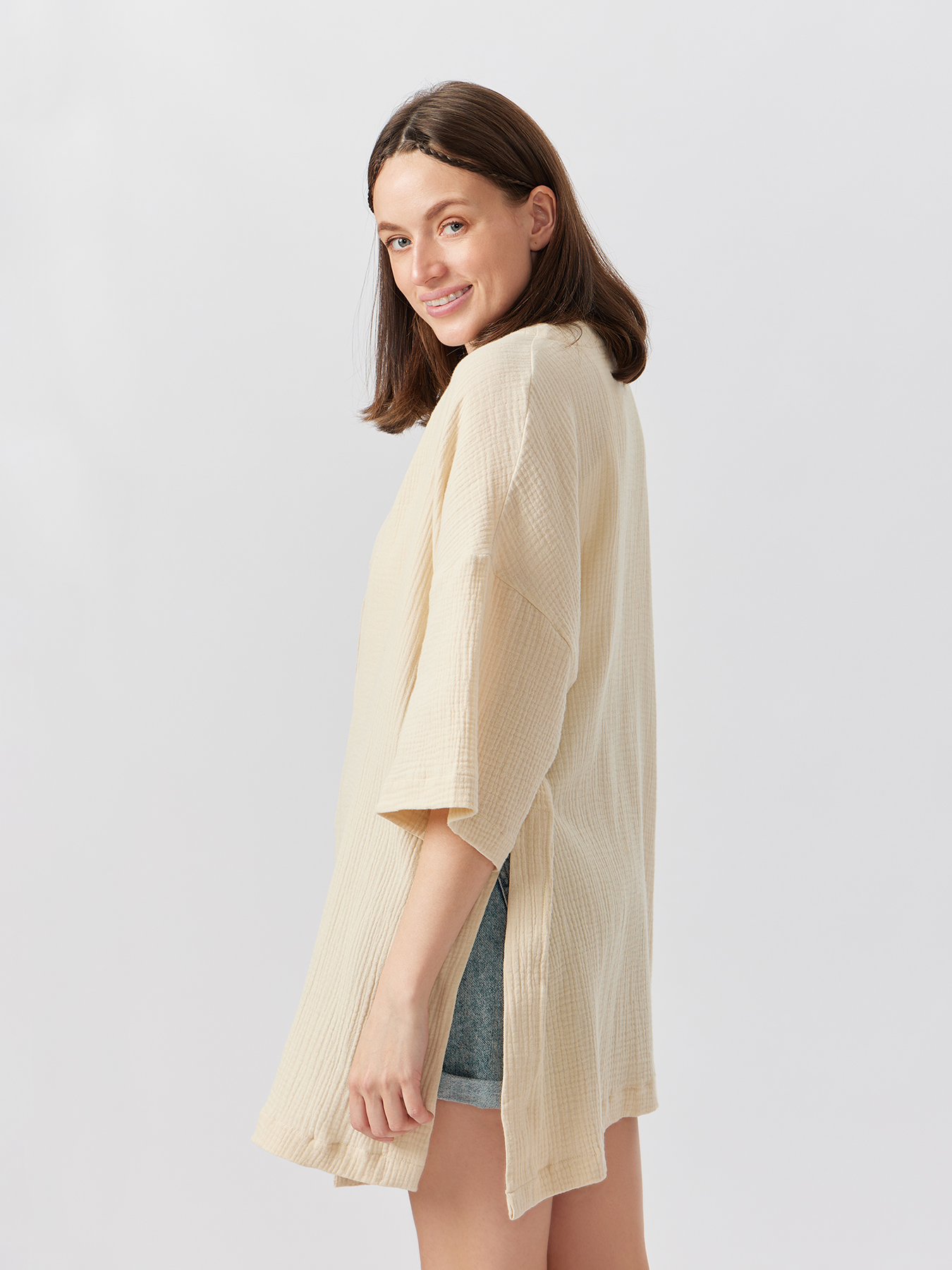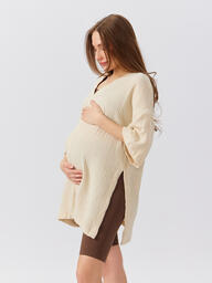 Стильная рубашка станет основой трендовых образов во время беременности и после родов. Благодаря актуальному крою оверсайз и разрезам по бокам изделие подойдет мамам с разным типом фигуры и на всех сроках ожидания малыша. Вещь из 100% хлопка подарит комфорт женщине и ребёнку. Модель «кимоно» пригодится в городе, в офисе, на пляже, как верхний слой на футболку или майку, а также может использоваться как халат. Рубашка отлично сочетается с легинсами, шортами, брюками, юбками, купальниками. Благодаря лаконичному дизайну и классическим цветам изделие легко вписать в гардероб.