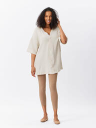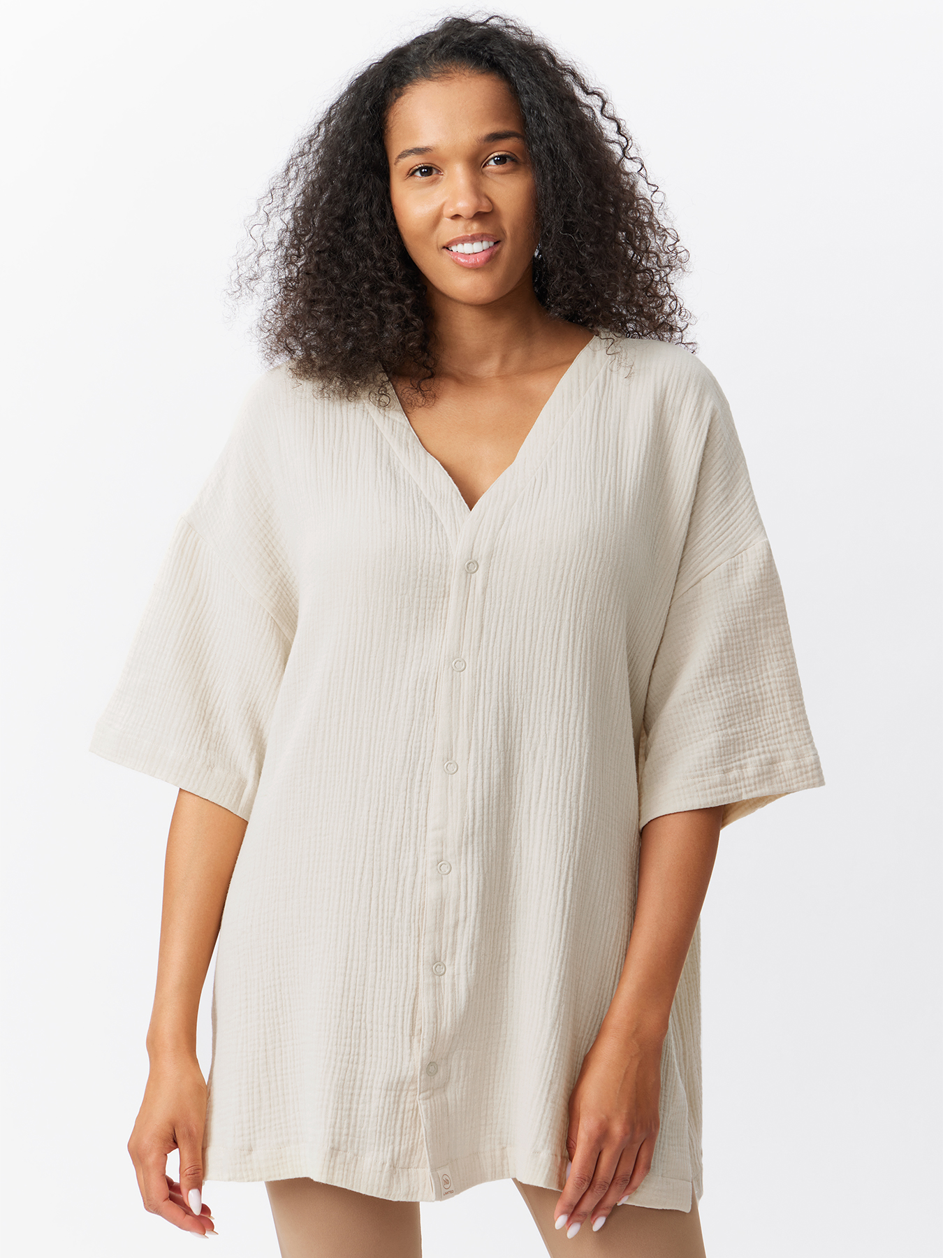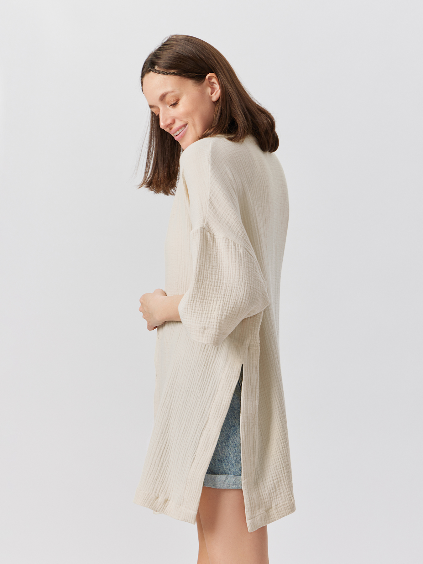 Стильная рубашка станет основой трендовых образов во время беременности и после родов. Благодаря актуальному крою оверсайз и разрезам по бокам изделие подойдет мамам с разным типом фигуры и на всех сроках ожидания малыша. Вещь из 100% хлопка подарит комфорт женщине и ребёнку. Модель «кимоно» пригодится в городе, в офисе, на пляже, как верхний слой на футболку или майку, а также может использоваться как халат. Рубашка отлично сочетается с легинсами, шортами, брюками, юбками, купальниками. Благодаря лаконичному дизайну и классическим цветам изделие легко вписать в гардероб.
