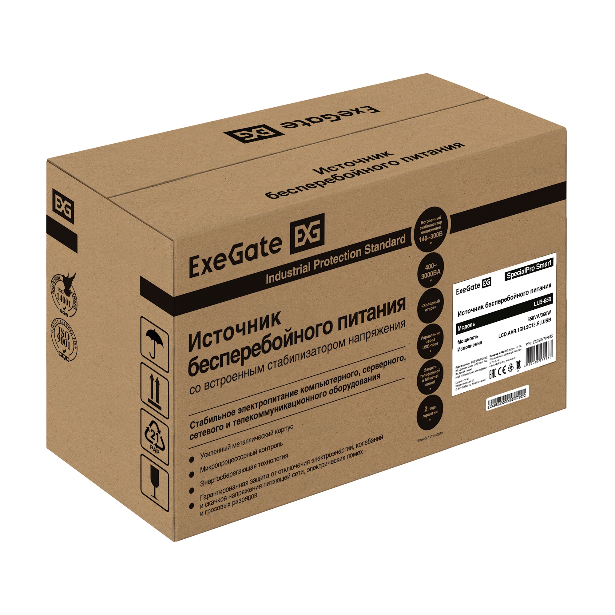 ИБП ExeGate SpecialPro Smart LLB-650.LCD.AVR.1SH.2C13.RJ.USB (650VA/360W, LCD, AVR,1*Schuko+2*C13, RJ45/11,USB, батарея 12V 7Ah, металлический корпус, Black)