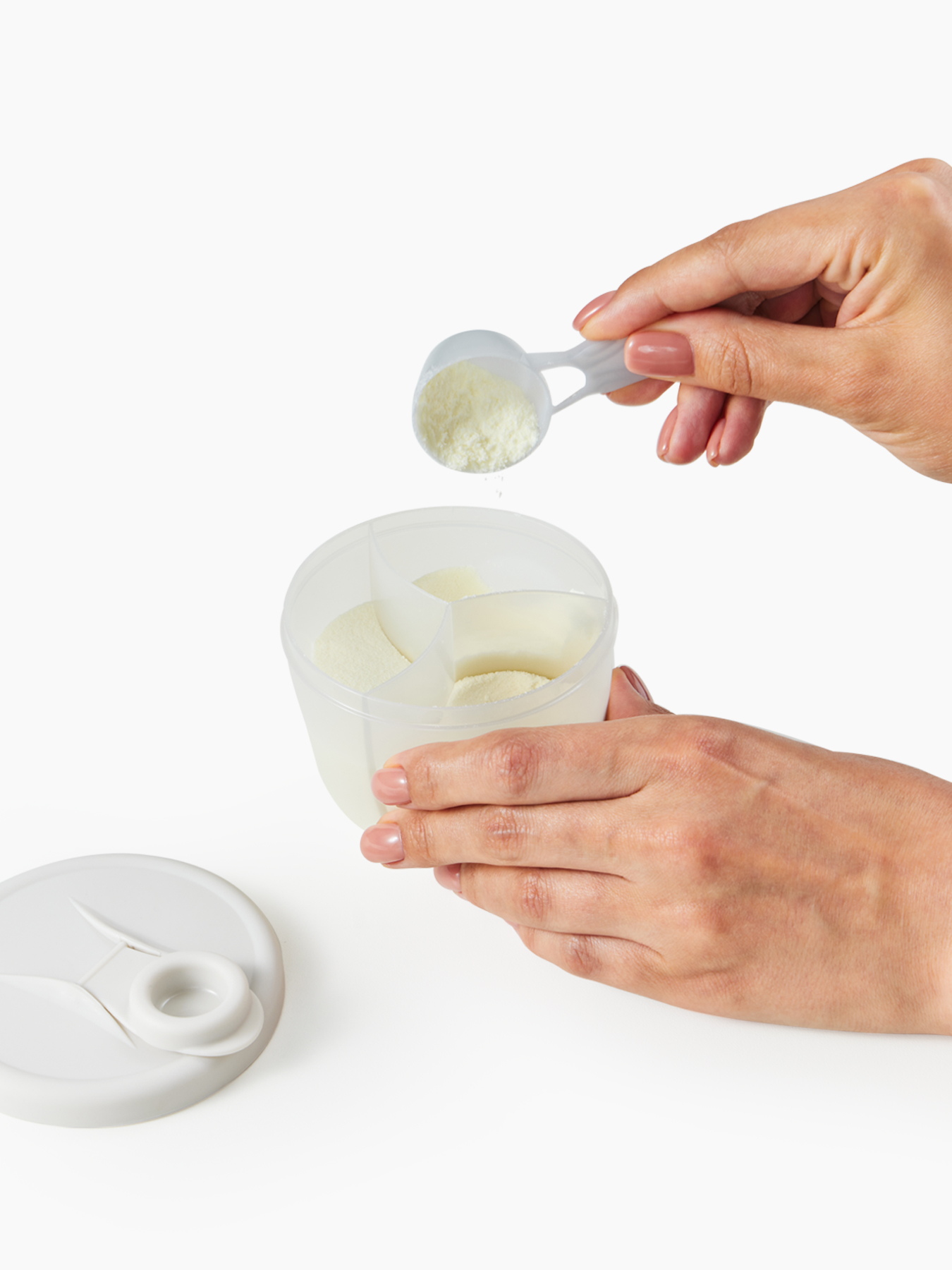Контейнер незаменим на долгих прогулках и в поездках, обеспечивая герметичное хранение смеси без пересыпания из одного отсека в другой. Надежная конструкция и удобное использование делают его идеальным помощником в заботе о малыше, где бы вы ни находились.