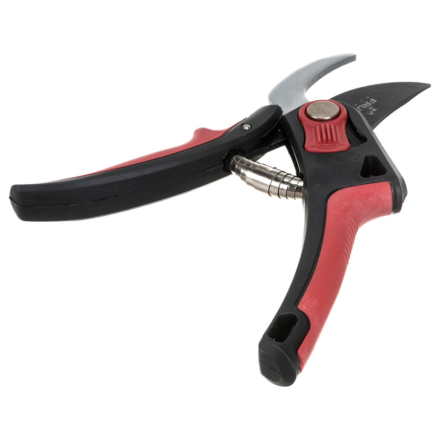 Секатор оснащен регулировкой раскрытия, что позволяет работать одним инструментом как с тонкими побегами, так и с толстыми ветвями.