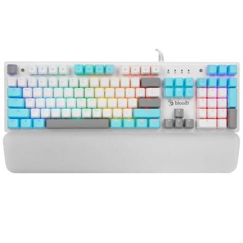 Полноразмерная проводная клавиатура A4Tech Bloody S515R имеет 104 клавиши с отдельным блоком цифр и линейкой Fn с различными функциями. Все клавиши разделены на 3 цвета по функциям: буквы и цифры белые, стрелки, пробел и некоторые другие – серые, а колонка Fn – голубая. Для удобства работы в темноте или при слабом искусственном освещении можно включить трехцветную RBG-подсветку.