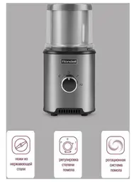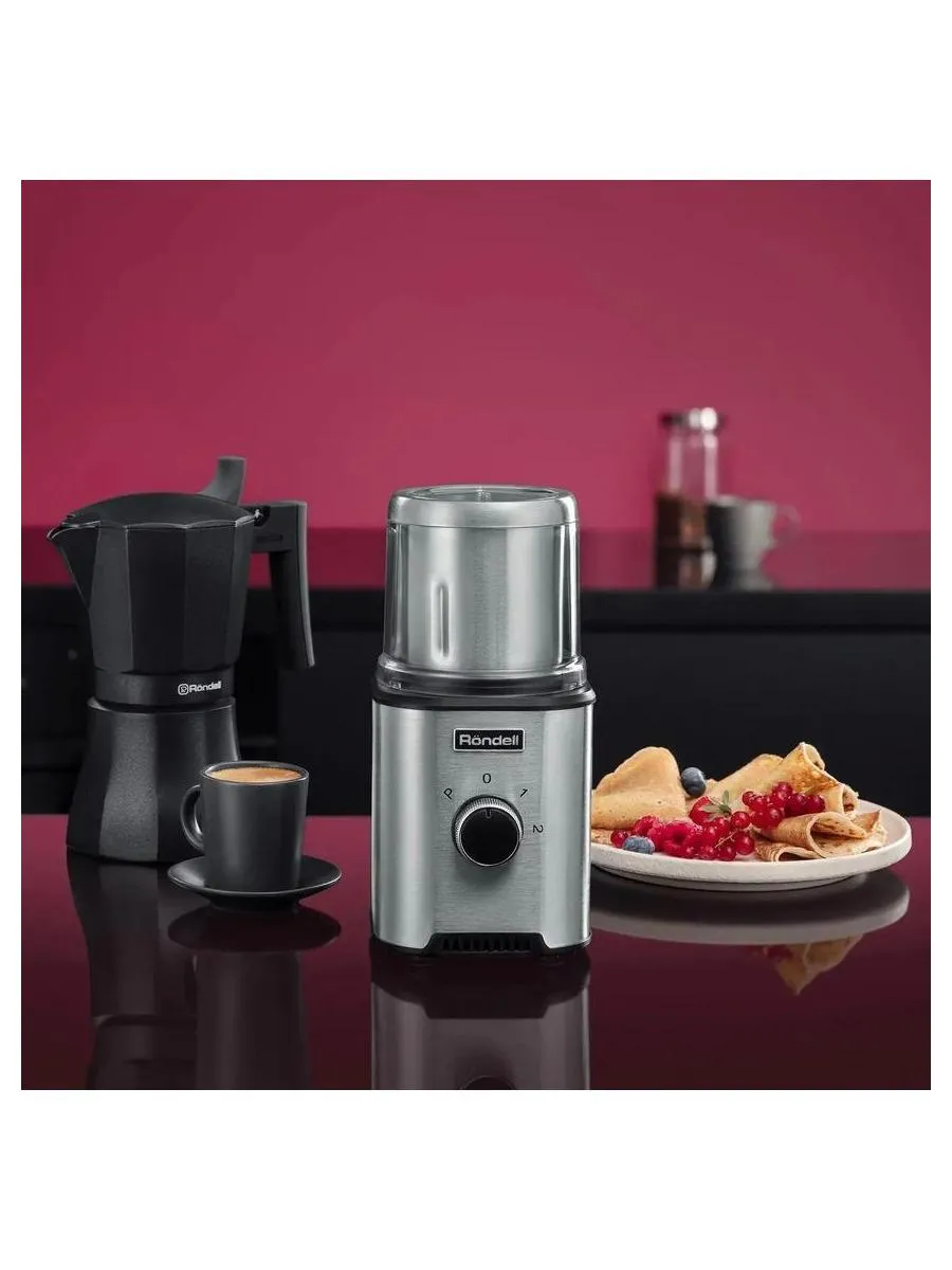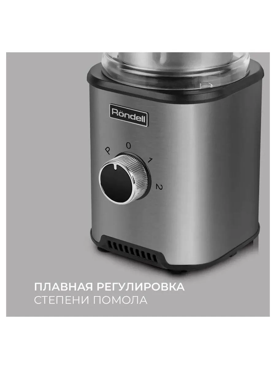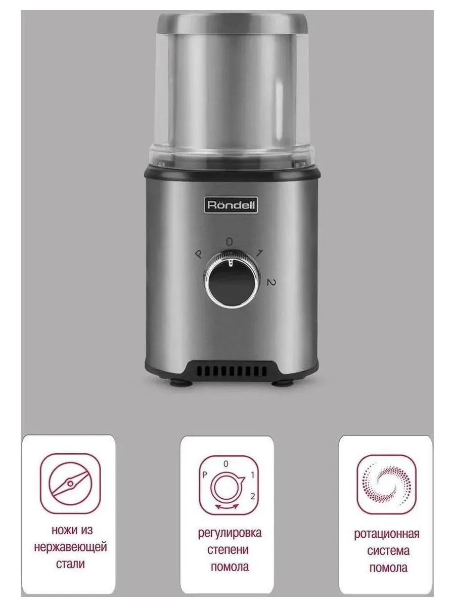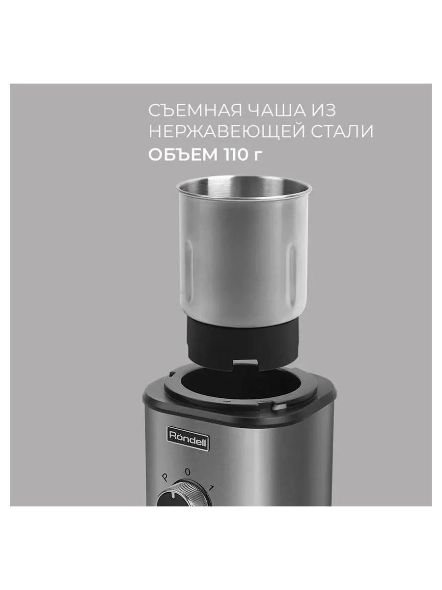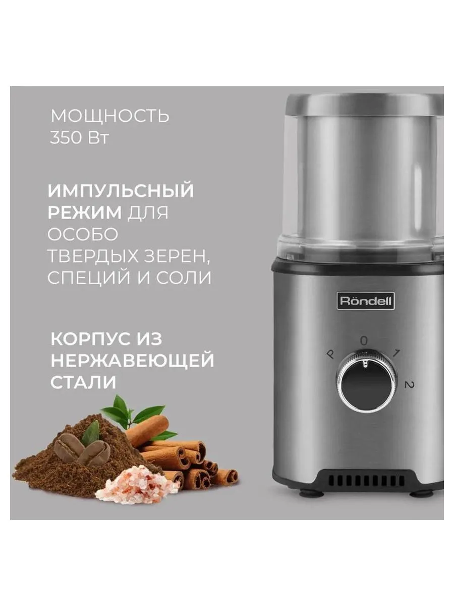Описание товара Кофемолка Rondell RDE-1150 350Вт сист.помол.:ротац.нож вместим.:110гр серебристый