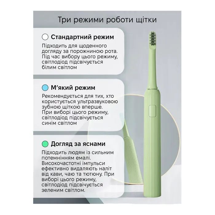 • Режими роботи щоденне чищення , відбілювання , чутливий режим