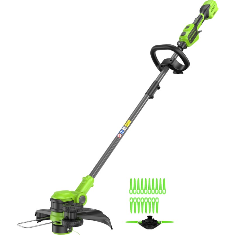 Аккумуляторный триммер Greenworks GD24LT331 — лёгкий и мощный аккумуляторный триммер, идеально подходящий для ухода за газоном на приусадебном участке, даче или вокруг дома. Работает от аккумуляторов платформы Greenworks 24V, не нуждается в бензине или розетке — вы получаете свободу передвижения и чистую, экологичную работу без выхлопа и шума. Модель сочетает в себе сразу два инструмента: триммер и кромкорез. В комплекте предусмотрены не только катушка с леской, но и набор из 20 пластиковых ножей, которые легко справляются с травой средней густоты. Эргономичная конструкция, регулируемый угол наклона режущей части, двухскоростной режим, бесщёточный двигатель DigiPro и продуманная развесовка делают этот инструмент отличным выбором как для новичков, так и для опытных пользователей.