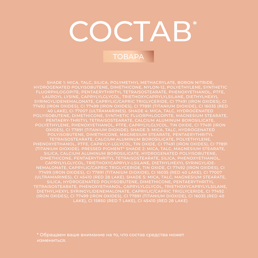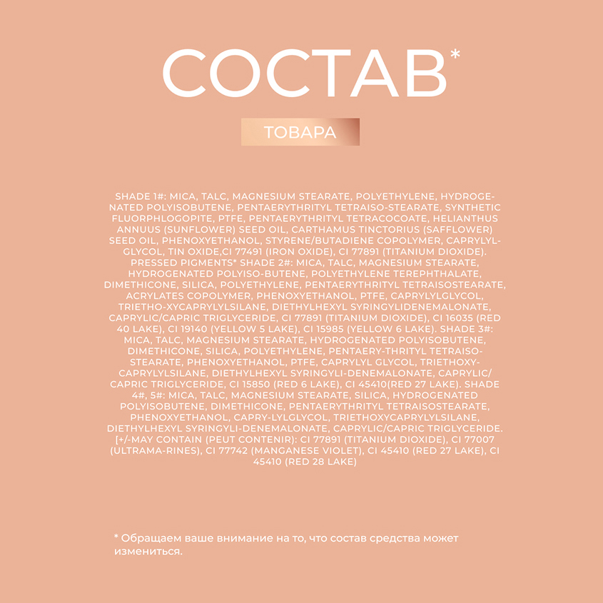 SHADE 1: MICA, TALC, SILICA, POLYMETHYL METHACRYLATE, BORON NITRIDE, HYDROGENATED POLYISOBUTENE, DIMETHICONE, NYLON-12, POLYETHYLENE, SYNTHETIC FLUORPHLOGOPITE, PENTAERYTHRITYL TETRAISOSTEARATE, PHENOXYETHANOL, PTFE, LAUROYL LYSINE, CAPRYLYLGLYCOL, TRIETHOXYCAPRYLYLSILANE, DIETHYLHEXYL SYRINGYLIDENEMALONATE, CAPRYLIC/CAPRIC TRIGLYCERIDE, CI 77491 (IRON OXIDES), CI 77492 (IRON OXIDES), CI 77499 (IRON OXIDES), CI 77891 (TITANIUM DIOXIDE), CI 16035 (RED 40 LAKE), CI 77007 (ULTRAMARINES). SHADE 4: MICA, TALC, HYDROGENATED POLYISOBUTENE, DIMETHICONE, SYNTHETIC FLUORPHLOGOPITE, MAGNESIUM STEARATE, PENTAERYTHRITYL TETRAISOSTEARATE, CALCIUM ALUMINUM BOROSILICATE, POLYETHYLENE, PHENOXYETHANOL, PTFE, CAPRYLYLGLYCOL, TIN OXIDE, CI 77491 (IRON OXIDES), CI 77891 (TITANIUM DIOXIDE). SHADE 3: MICA, TALC, HYDROGENATED POLYISOBUTENE, DIMETHICONE, MAGNESIUM STEARATE, PENTAERYTHRITYL TETRAISOSTEARATE, CALCIUM ALUMINUM BOROSILICATE, POLYETHYLENE, PHENOXYETHANOL, PTFE, CAPRYLYLGLYCOL, TIN OXIDE, CI 77491 (IRON OXIDES), CI 77891 (TITANIUM DIOXIDE). PRESSED PIGMENT* SHADE 2: MICA, TALC, MAGNESIUM STEARATE, SILICA, CALCIUM ALUMINUM BOROSILICATE, HYDROGENATED POLYISOBUTENE, DIMETHICONE, PENTAERYTHRITYL TETRAISOSTEARATE, SILICA, PHENOXYETHANOL, CAPRYLYLGLYCOL, TRIETHOXYCAPRYLYLSILANE, DIETHYLHEXYL SYRINGYLIDENEMALONATE, CAPRYLIC/CAPRIC TRIGLYCERIDE, TIN OXIDE, CI 77492 (IRON OXIDES), CI 77499 (IRON OXIDES), CI 77891 (TITANIUM DIOXIDE), CI 16035 (RED 40 LAKE), CI 77007 (ULTRAMARINES), CI 45410 (RED 28 LAKE). SHADE 5: MICA, TALC, MAGNESIUM STEARATE, SILICA, HYDROGENATED POLYISOBUTENE, DIMETHICONE, PENTAERYTHRITYL TETRAISOSTEARATE, PHENOXYETHANOL, CAPRYLYLGLYCOL, TRIETHOXYCAPRYLYLSILANE, DIETHYLHEXYL SYRINGYLIDENEMALONATE, CAPRYLIC/CAPRIC TRIGLYCERIDE, CI 77492 (IRON OXIDES), CI 77499 (IRON OXIDES), CI 77891 (TITANIUM DIOXIDE), CI 16035 (RED 40 LAKE), CI 15850 (RED 7 LAKE), CI 45410 (RED 28 LAKE).