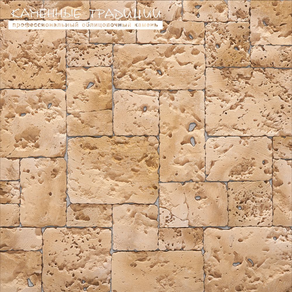 Укладывается на клей на цементной основе. Благодаря рисунку этого отделочного камня и пересечению швов, создается оригинальная композиция. Фактура спроектирована таким образом, что сквозные каверны и некоторые неровности в швах нуждаются в заполнении клеевым составом. При укладке следует избегать длинных вертикальных швов. Облицовка осуществляется быстро и без проблем.