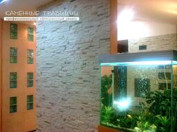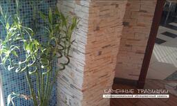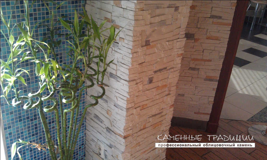 Укладывается на клей на цементной основе со смещением по вертикальным швам. Облицовка осуществляется быстро и без проблем.