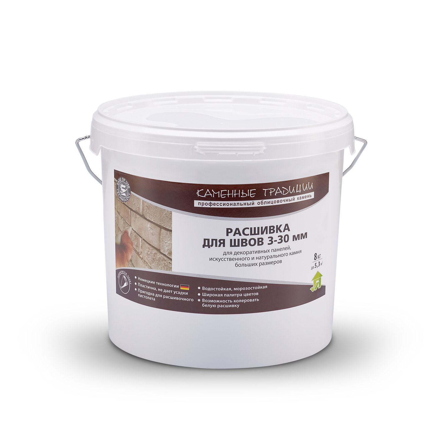 Выбирая цвета расшивки, учитывайте, что они существенно влияют на восприятие поверхности - белая подчеркнёт каждый отдельный кирпичик, а расшивка в тон камня сделает кладку более монолитной. Стандартные предлагаемые цвета расшивки - Белый, Платина, Графит, Ваниль, Зелёный Чай, Мята, Слоновая Кость, Какао, Терракот, Шоколад. В комплект с расшивкой входят пакеты для нанесения.