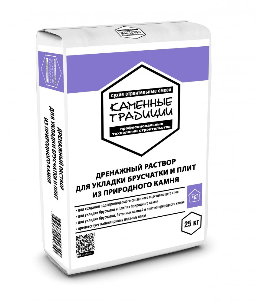 ОПИСАНИЕ Дренажный раствор применяется для укладки брусчатки и плит из природного камня. Это готовый к применению материал в виде сухой смеси на основе цементного вяжущего, минерального заполнителя и специальных добавок.