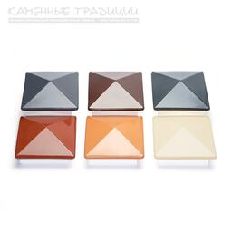 Декоративный колпак для устройства водостока со столбов сечением в полтора кирпича (аналог продукции польского производителя керамических оголовков Кинг Клинкер). Элементы изготавливаются из архитектурного бетона с термообработкой, ударопрочным покрытием и прокрашены в массе. Детали устойчивы как к морскому климату, так и к экстремальным условиям Крайнего Севера — производятся по технологии гидротехнического бетона.