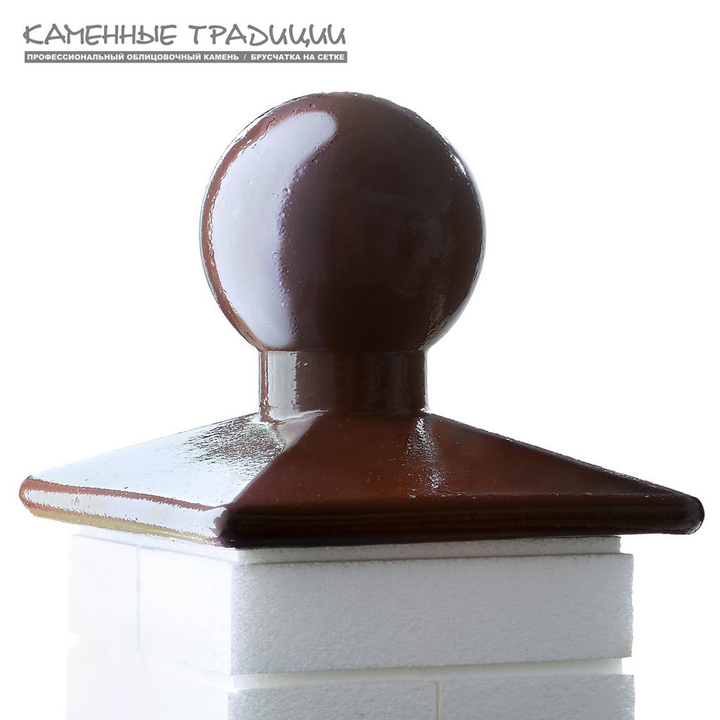 Декоративный колпак для устройства водостока со столбов сечением в полтора кирпича (аналог продукции польского производителя керамических оголовков Кинг Клинкер). Элементы изготавливаются из архитектурного бетона с термообработкой, ударопрочным покрытием и прокрашены в массе. Детали устойчивы как к морскому климату, так и к экстремальным условиям Крайнего Севера — производятся по технологии гидротехнического бетона.