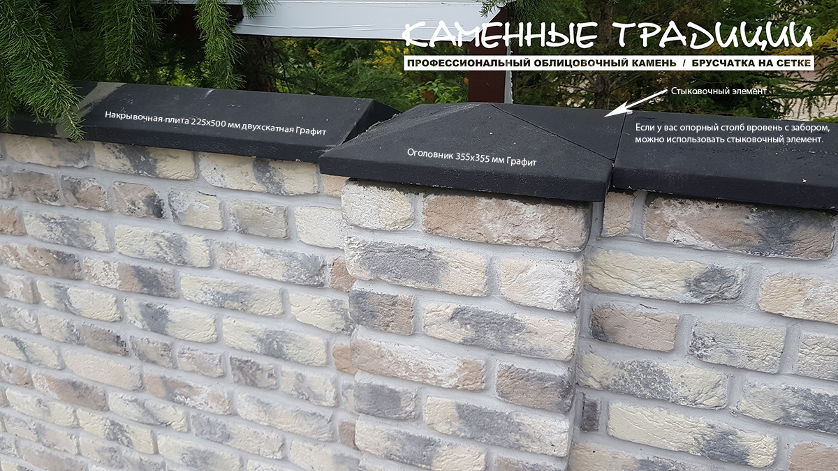 Применяется для устройства водостока с колонн ограждающих конструкций. Размеры декоративных элементов «Оголовник» разрабатывались под наиболее часто встречающиеся варианты столбов - длины у оснований 22,5 см, 35,5 см и 49,5 см. При проектировании облицовки кирпичных столбов декоративным камнем, учитывайте толщину камня и клеевого слоя. Материал может окрашиваться любыми типами фасадных красок.