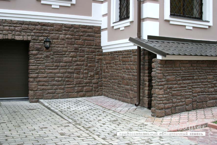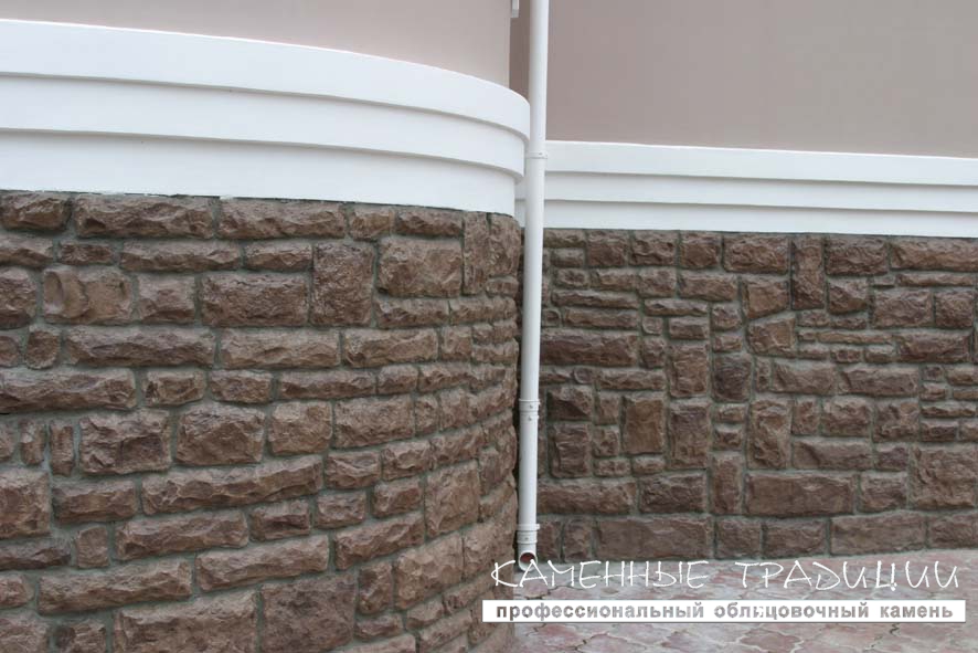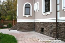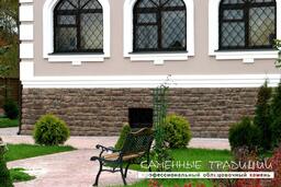 Известняк является отличным материалом для облицовки цоколя офисного здания или загородного дома. Элементы камня выполнены фрагментами в виде грубых булыжников. Монументальность крупных валунов, точность повторения фактуры природного камня и сложность цветовых тонов делают этот материал столь востребованным.