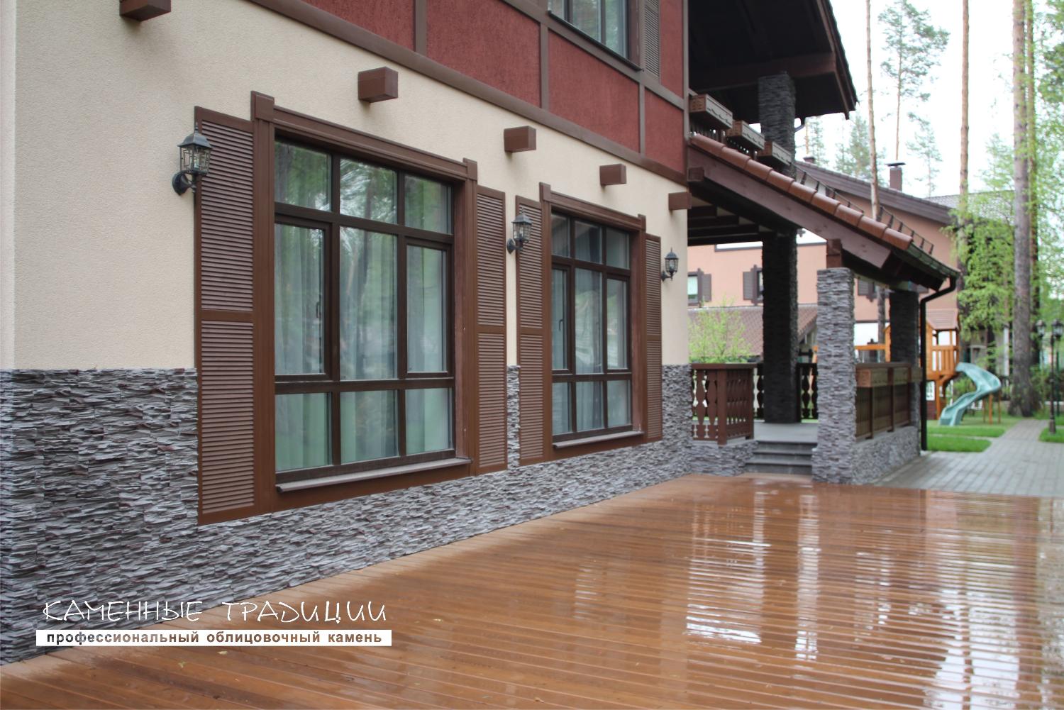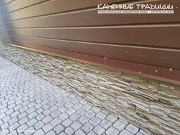 Укладывается на клей на цементной основе со смещением по вертикальным швам. Облицовка осуществляется быстро и без проблем.
