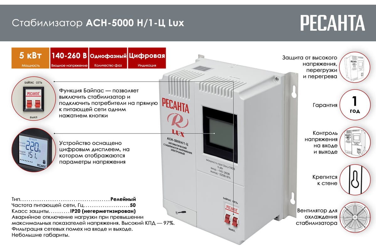 Однофазный стабилизатор напряжения Ресанта АСН 5000 Н/1-Ц Lux 63/6/16