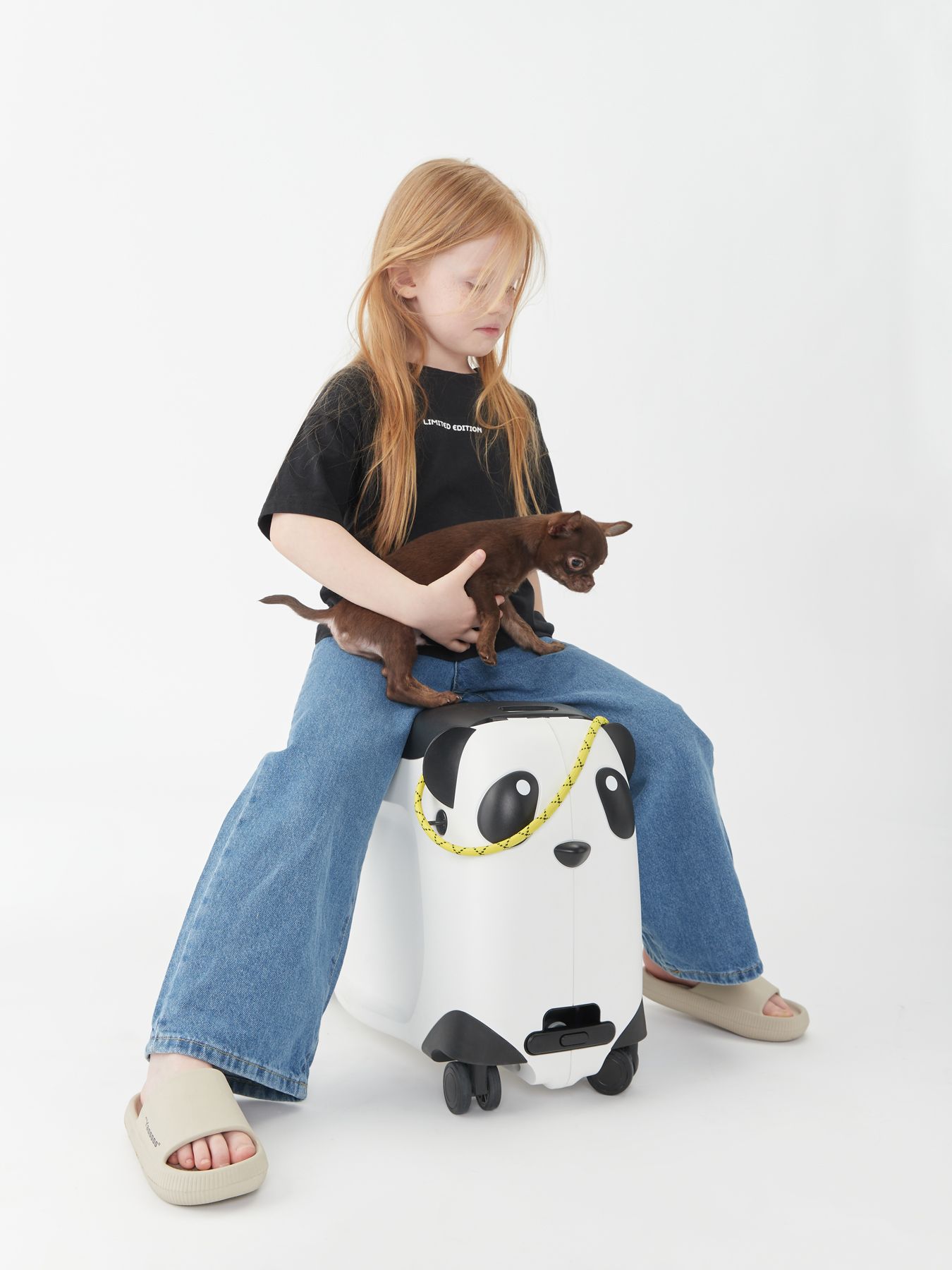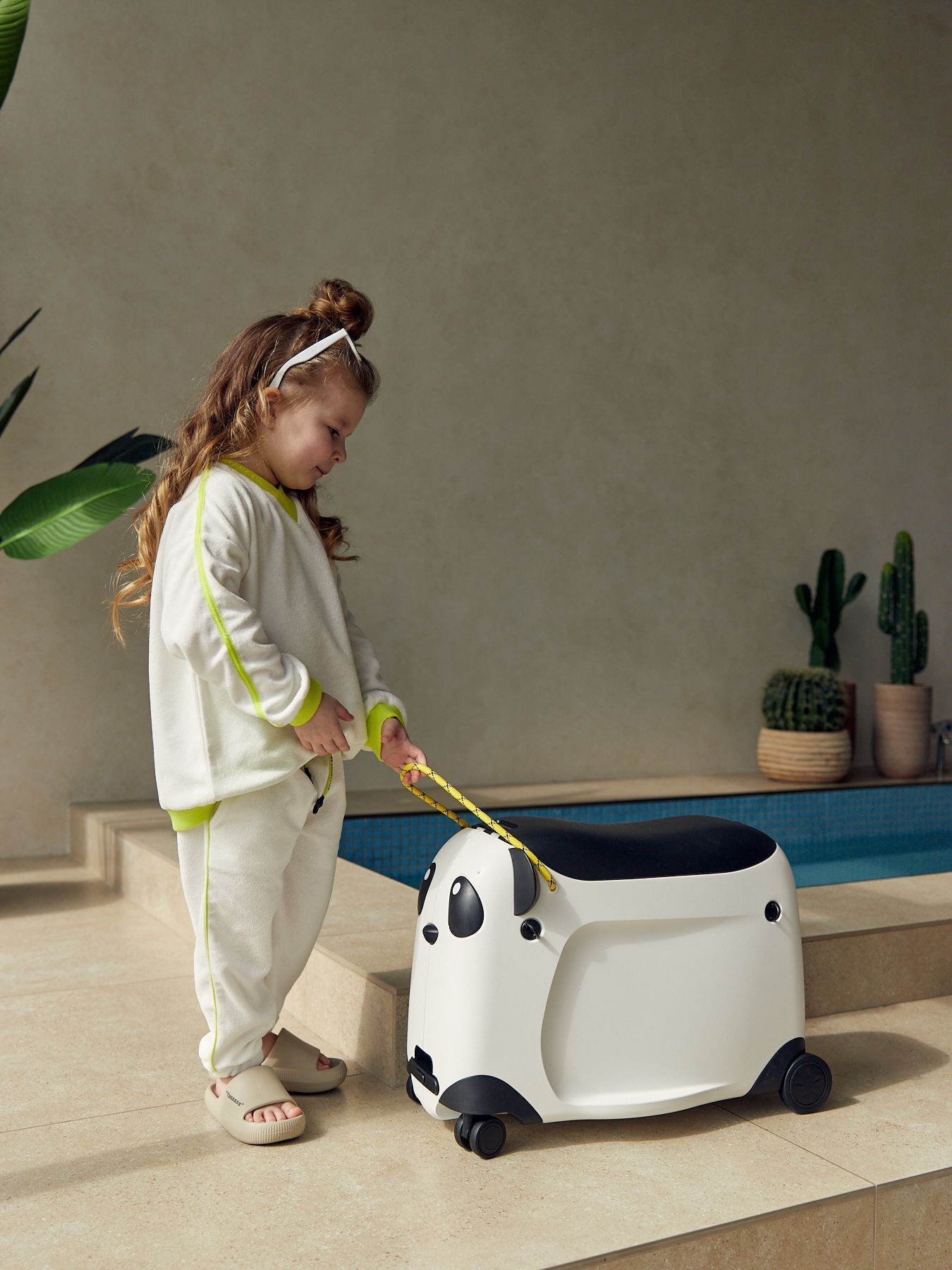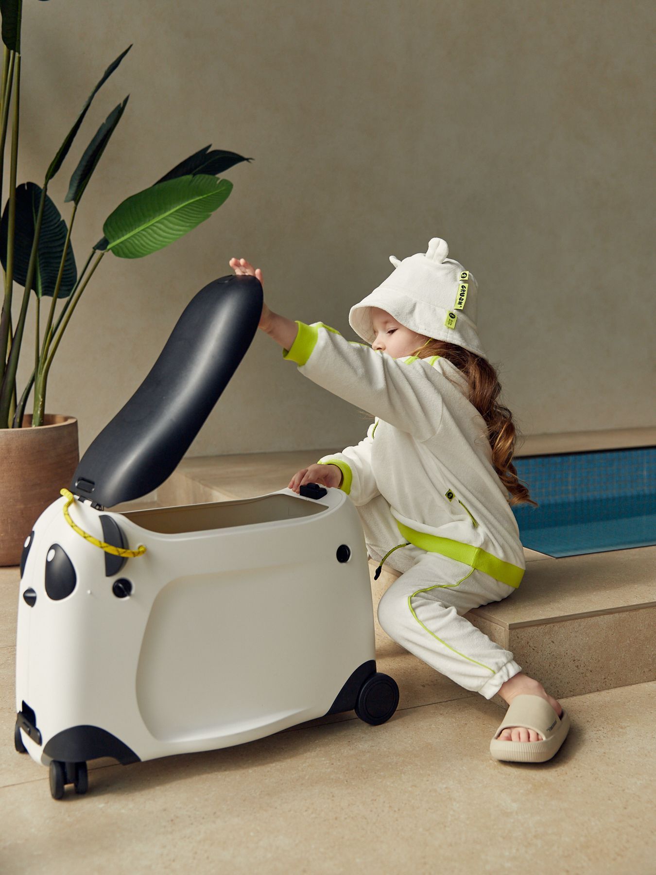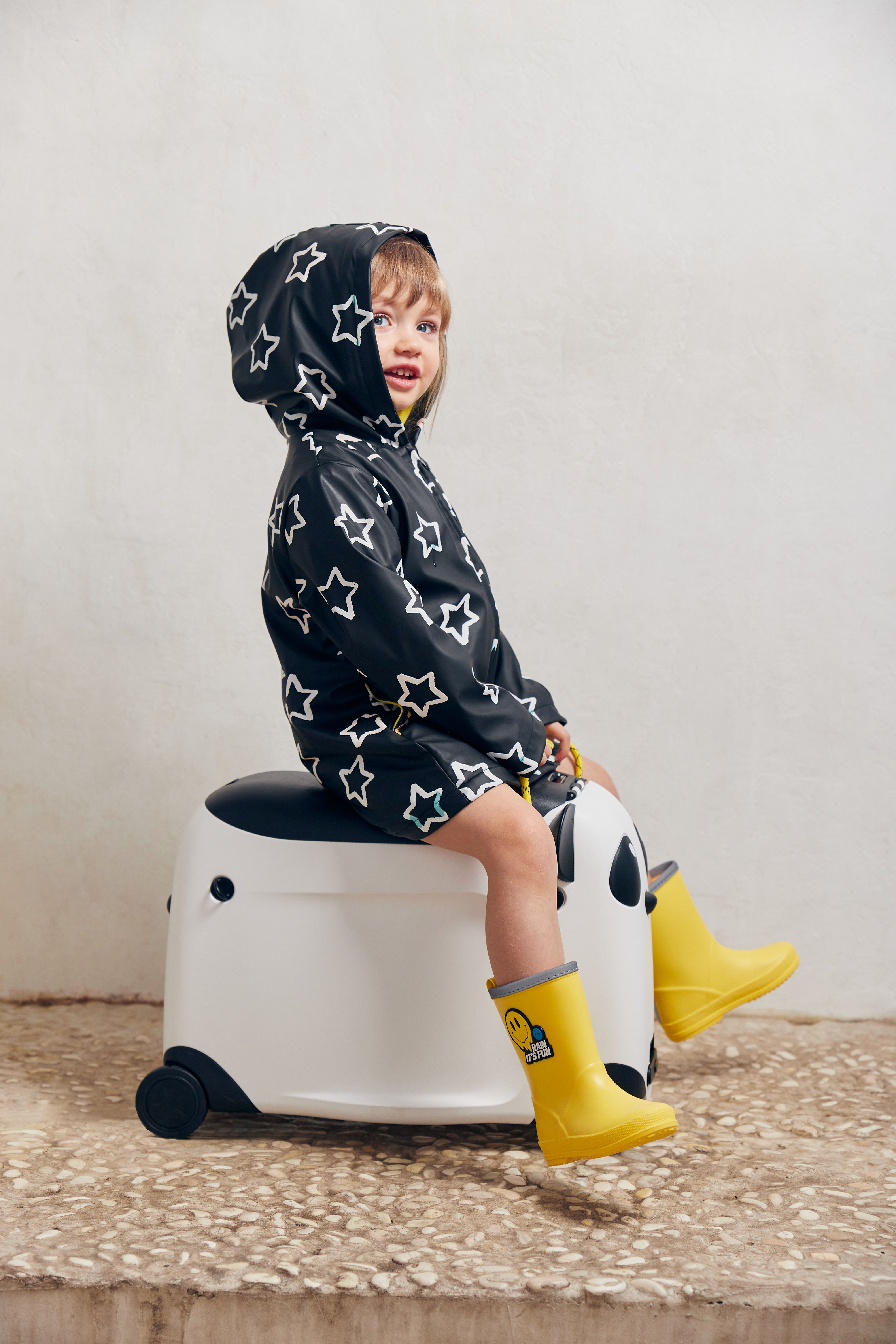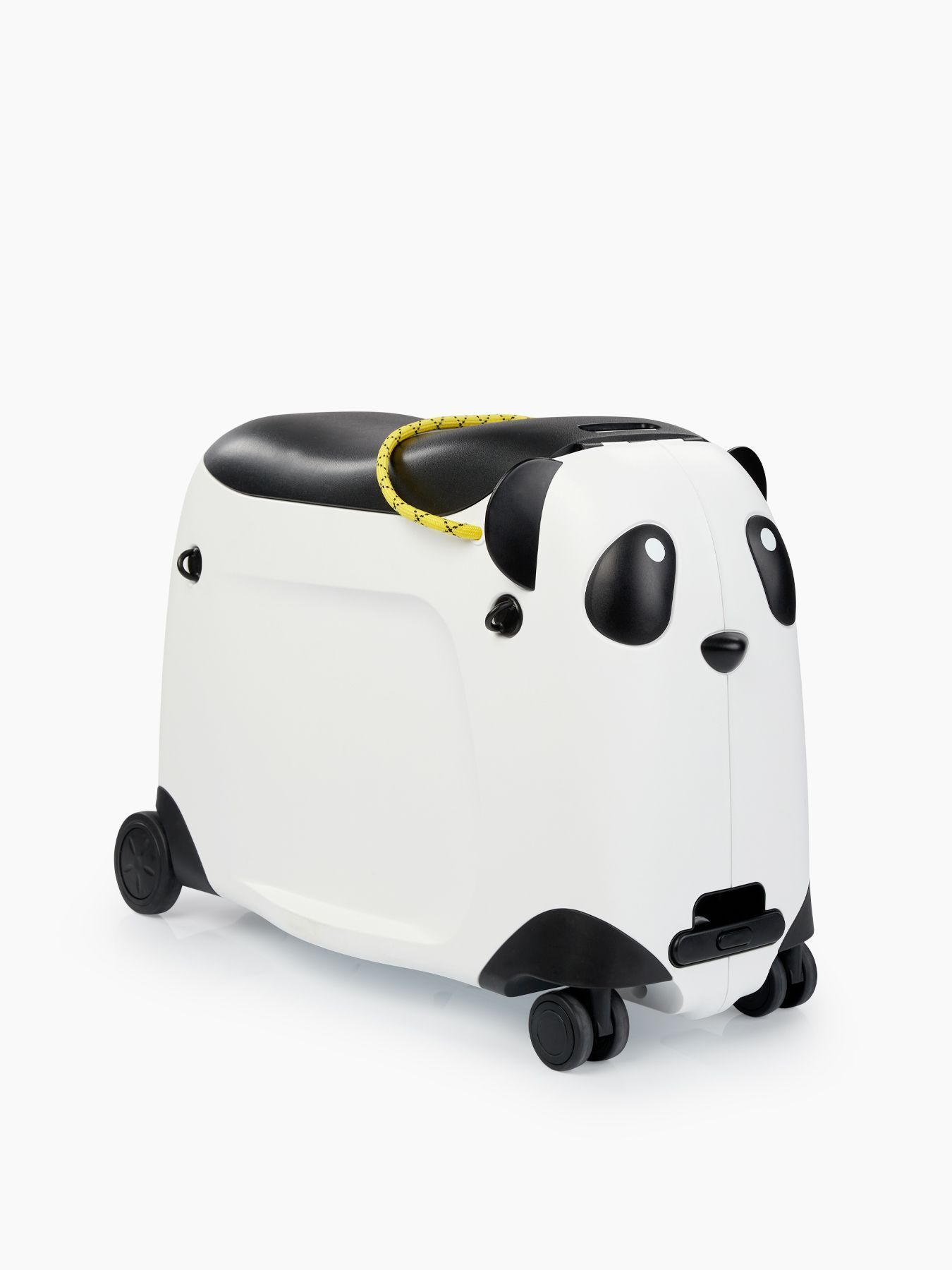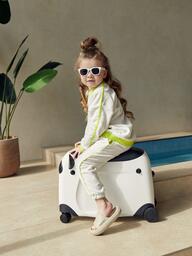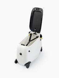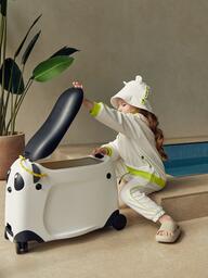 Чемодан-каталка позволит ребёнку почувствовать себя настоящим взрослым путешественником. Собирая собственный чемодан, малыш научится оценивать вещи по приоритету и быть самостоятельным. Чемодан имеет откидное сиденье и загружается вертикально. Есть несколько вариантов транспортировки: ребёнку будет удобно браться за тканевую ручку сверху, а взрослым катить чемодан за телескопическую ручку или использовать плечевой ремень.