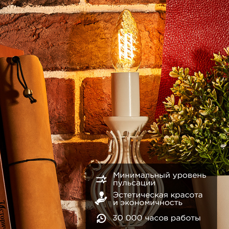 Филаментная золотистая лампа REXANT LCW35 в форме витой свечи мощностью 9.5Вт с цоколем E14 и с теплым белым свечением в 2700K прекрасно подходит для дизайнерского освещения комнат, домов, гостиниц, кафе, и других объектов.