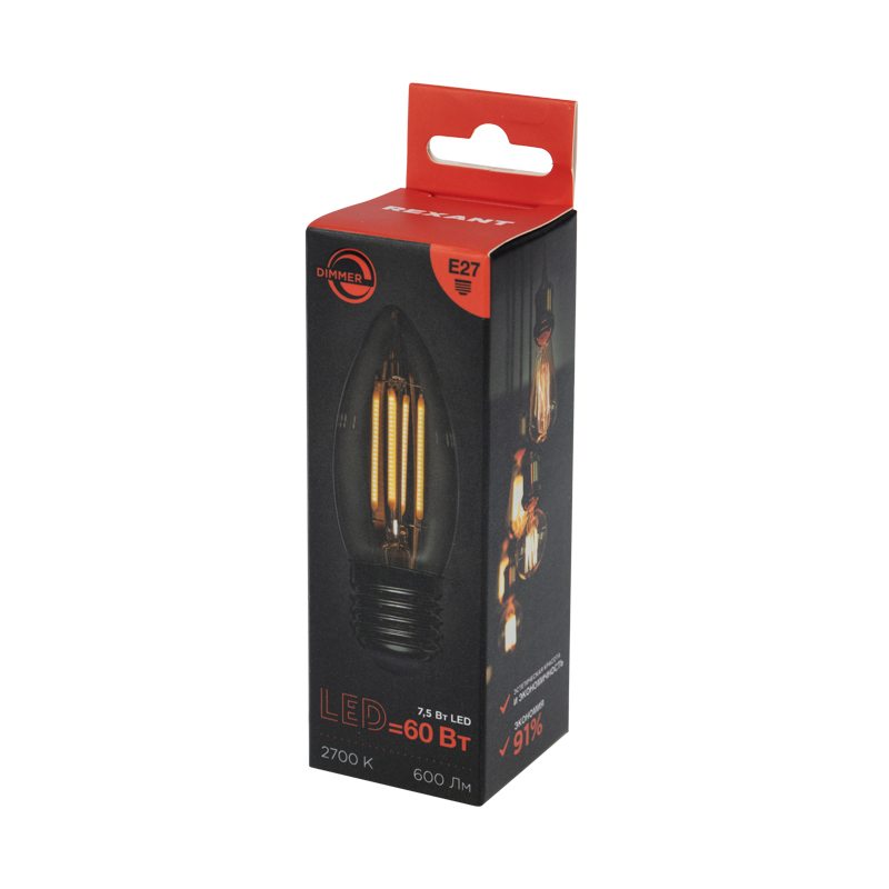 Филаментная прозрачная лампа REXANT CN35 в форме свечи мощностью 7.5Вт с цоколем E27 и с теплым белым свечением в 2700K прекрасно подходит для дизайнерского освещения комнат, домов, гостиниц, кафе, и других объектов.