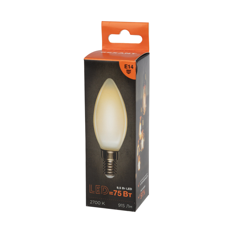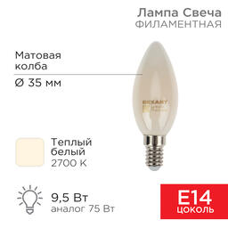 Филаментная матовая лампа REXANT CN35 в форме свечи мощностью 9.5Вт с цоколем E14 и с теплым белым свечением в 2700K прекрасно подходит для дизайнерского освещения комнат, домов, гостиниц, кафе, и других объектов.