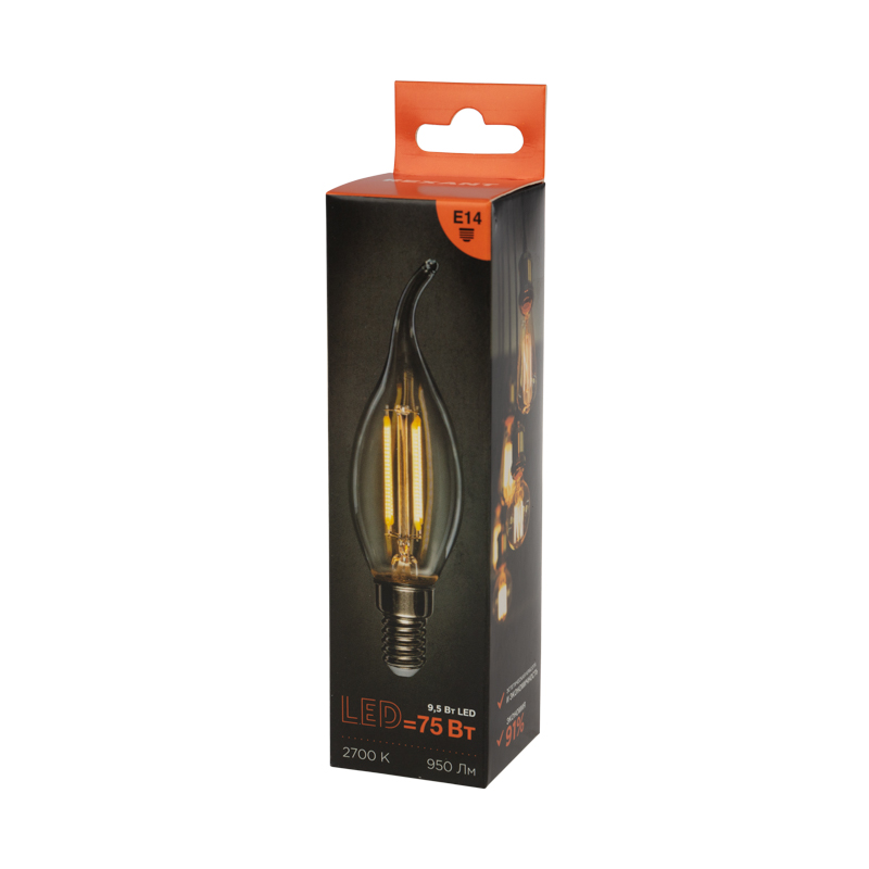 Филаментная прозрачная лампа REXANT CN37 в форме свечи на ветру мощностью 9.5Вт с цоколем E14 и с теплым белым свечением в 2700K прекрасно подходит для дизайнерского освещения комнат, домов, гостиниц, кафе, и других объектов.