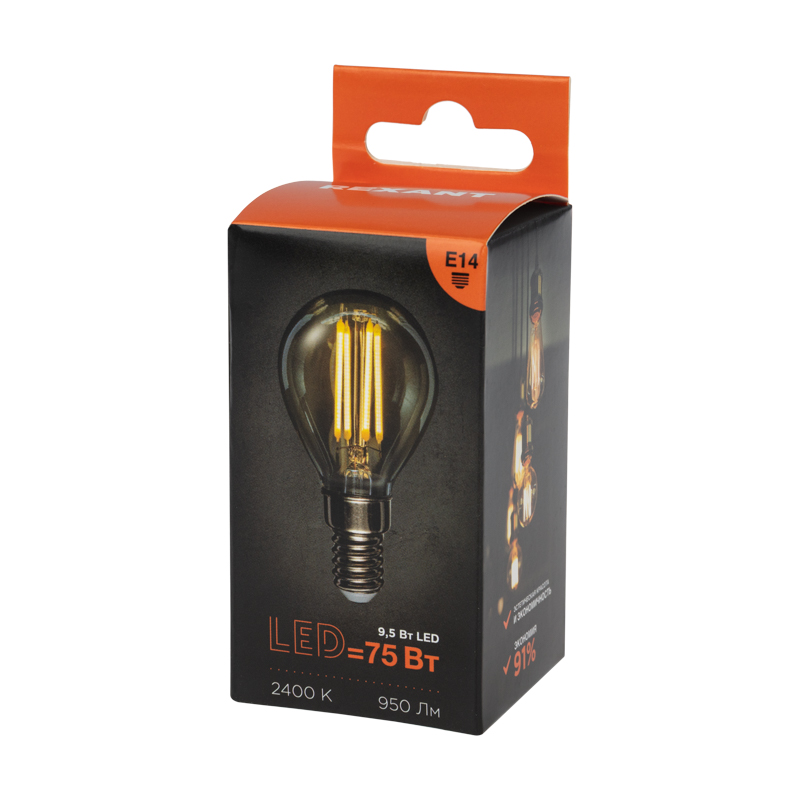 Филаментная золотистая лампа REXANT GL45 в форме шара мощностью 9.5Вт с цоколем E14 и с теплым белым свечением в 2700K прекрасно подходит для дизайнерского освещения комнат, домов, гостиниц, кафе, и других объектов.