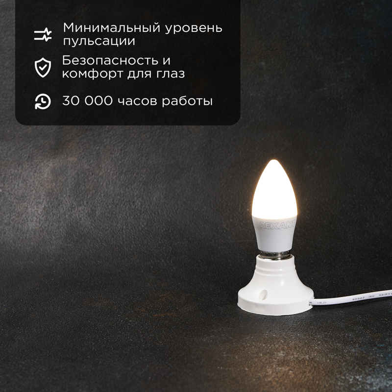 Светодиодные лампы марки REXANT – гарантия применения передовых технологий производства как комплектующих, так и полного цикла автоматизированной сборки и контроля качества изделия на каждом этапе, вплоть до упаковки товара. Один из немногих товаров на рынке, сочетающий цену экономичного сегмента и качественной цветопередачи (Ra>82), наличие электромагнитной совместимиости (EMC), минимальной пульсации свечения (1-5%), гарантийного срока 2 года.Срок службы 30 000 часов, гарантированый световой поток без потери мощности с уровнем светоотдачи болле 90 лм/ватт.Большая гарантия - 2 годаПолная автоматизация производстваУникальное предложение на рынке по параметрам цена/качество/ассортиментное предложениеШирокий диапазон мощностей лампы- ассортимент шарики и свечи 7,5Вт, 9,5Вт, 11,5Вт- свечи на ветру 7,5 Вт цветностью 2700K, 4000K, 6500K- груша А60 9.5Вт, 11,5Вт, 15,5Вт, 20,5Вт, 25,5Вт- лампа рефлектор-спот GU5.3 9,5Вт- лампа рефлектор-спот GX53 10,5Вт 15,5ВтЭлектромагнитная совместимость (ЭМС)Низкая пульсация <5%Высокая цветопередача Ra>82