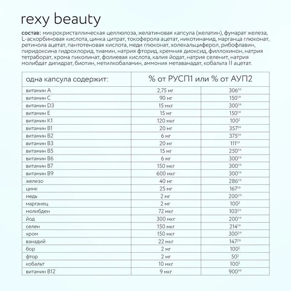 • Витамины A, E, C, B5, B3, B9, B6, B2, B7, B12, B1, D3, K1