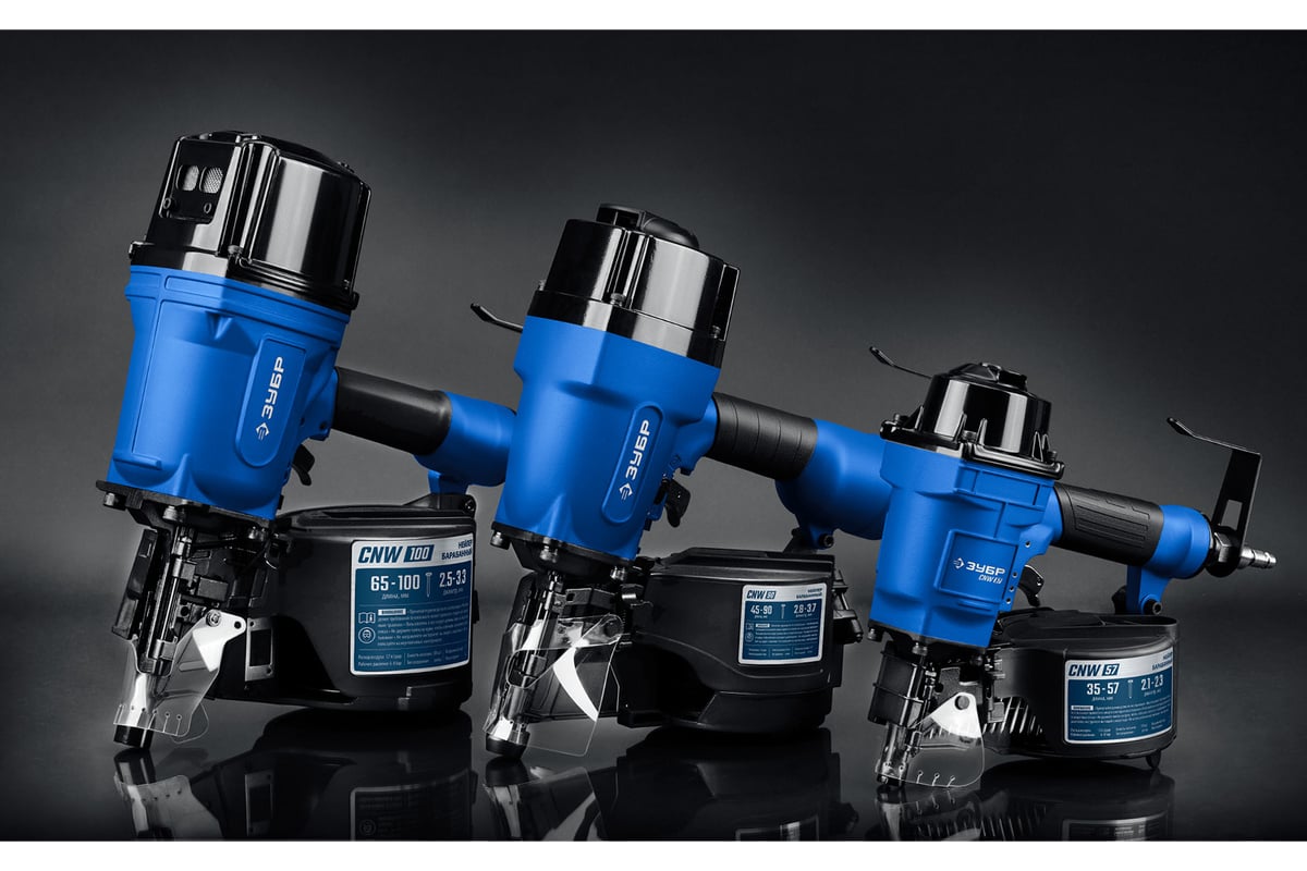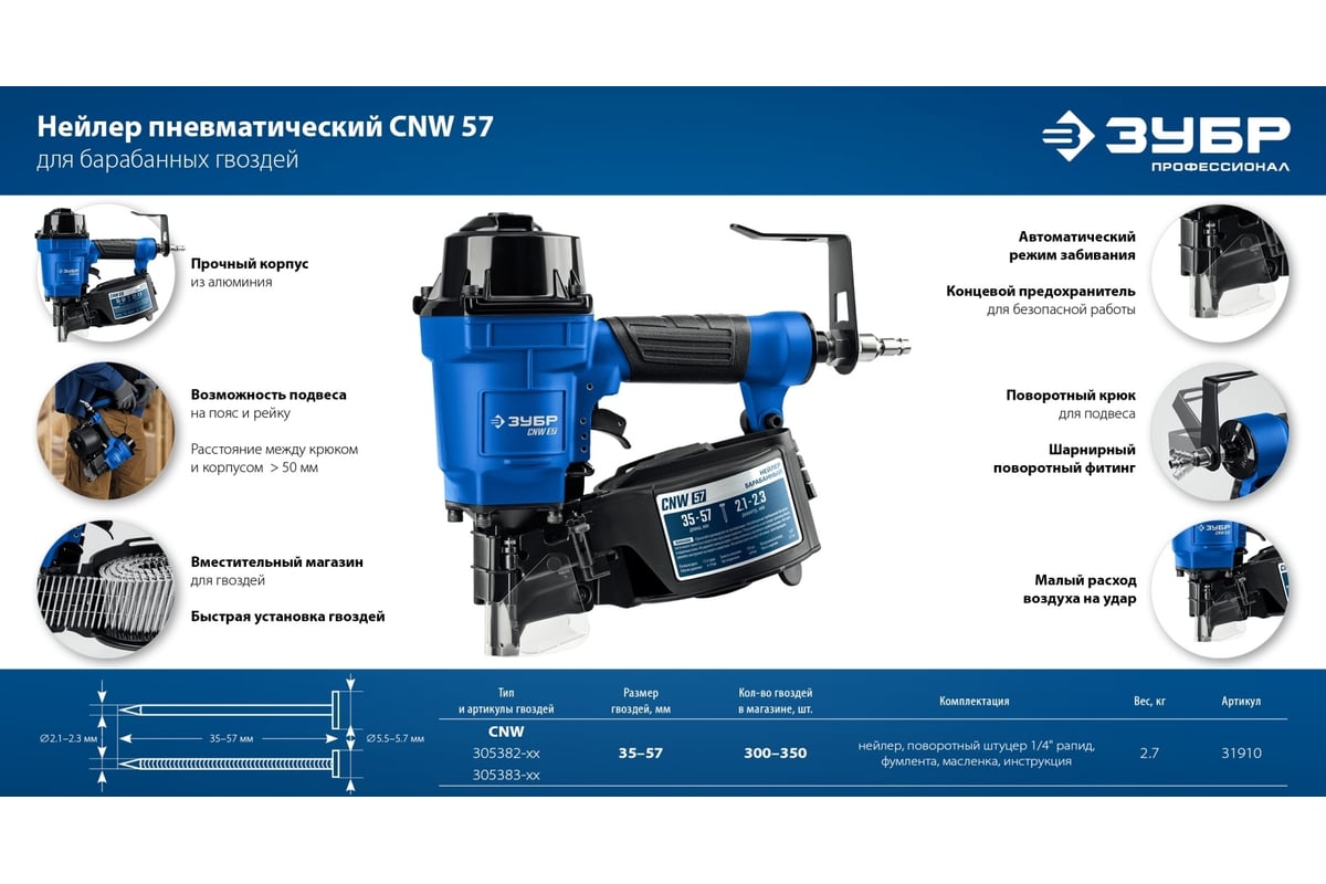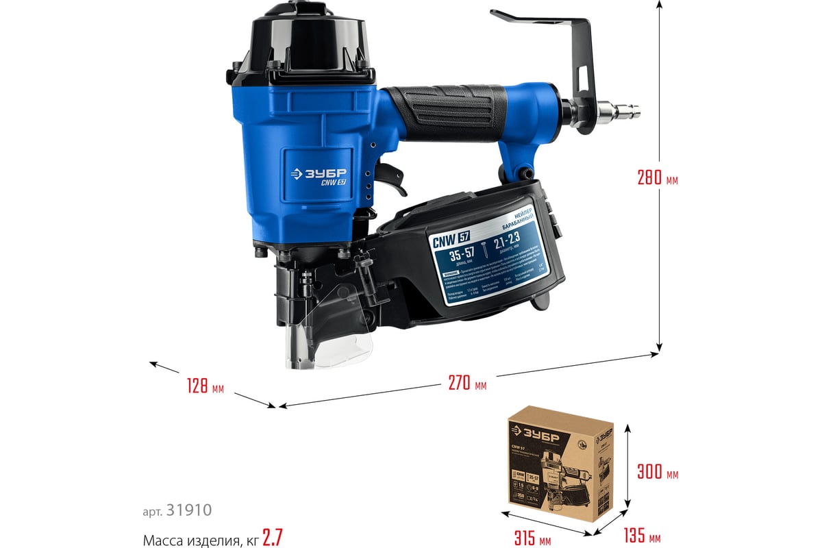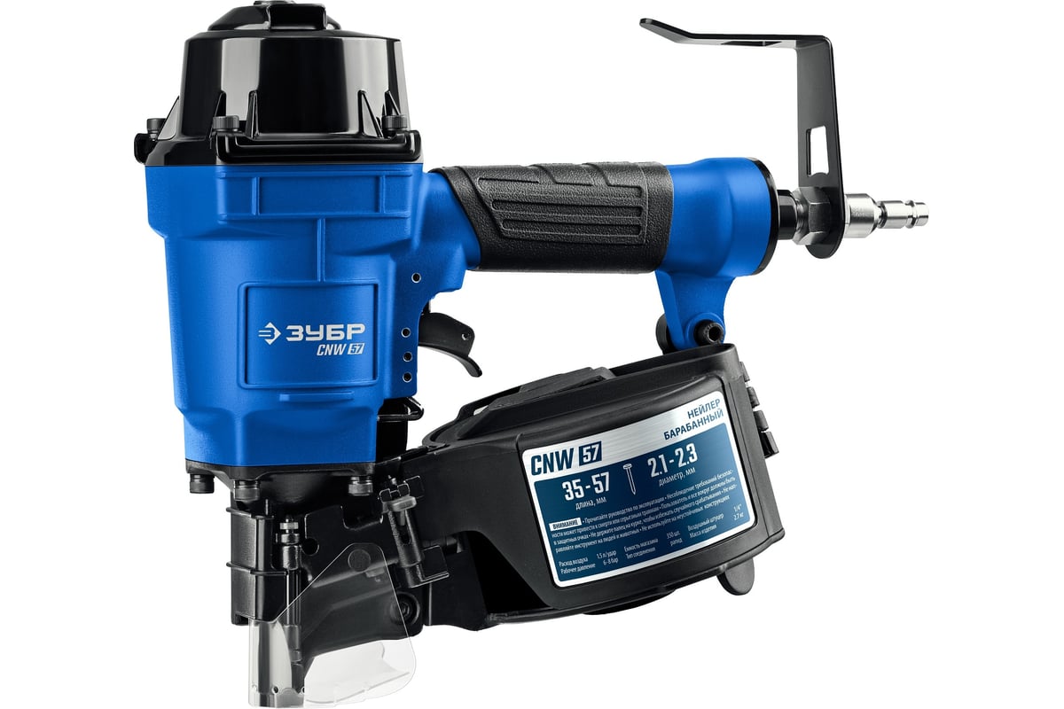ЗУБР Профессионал CNW-57 Пневматический нейлер для барабанных гвоздей 31910 предназначен для производства паллет (поддонов) и других изделий из дерева, таких как тара, ящики и упаковка с гвоздями длиной 35-57 мм барабанного типа.