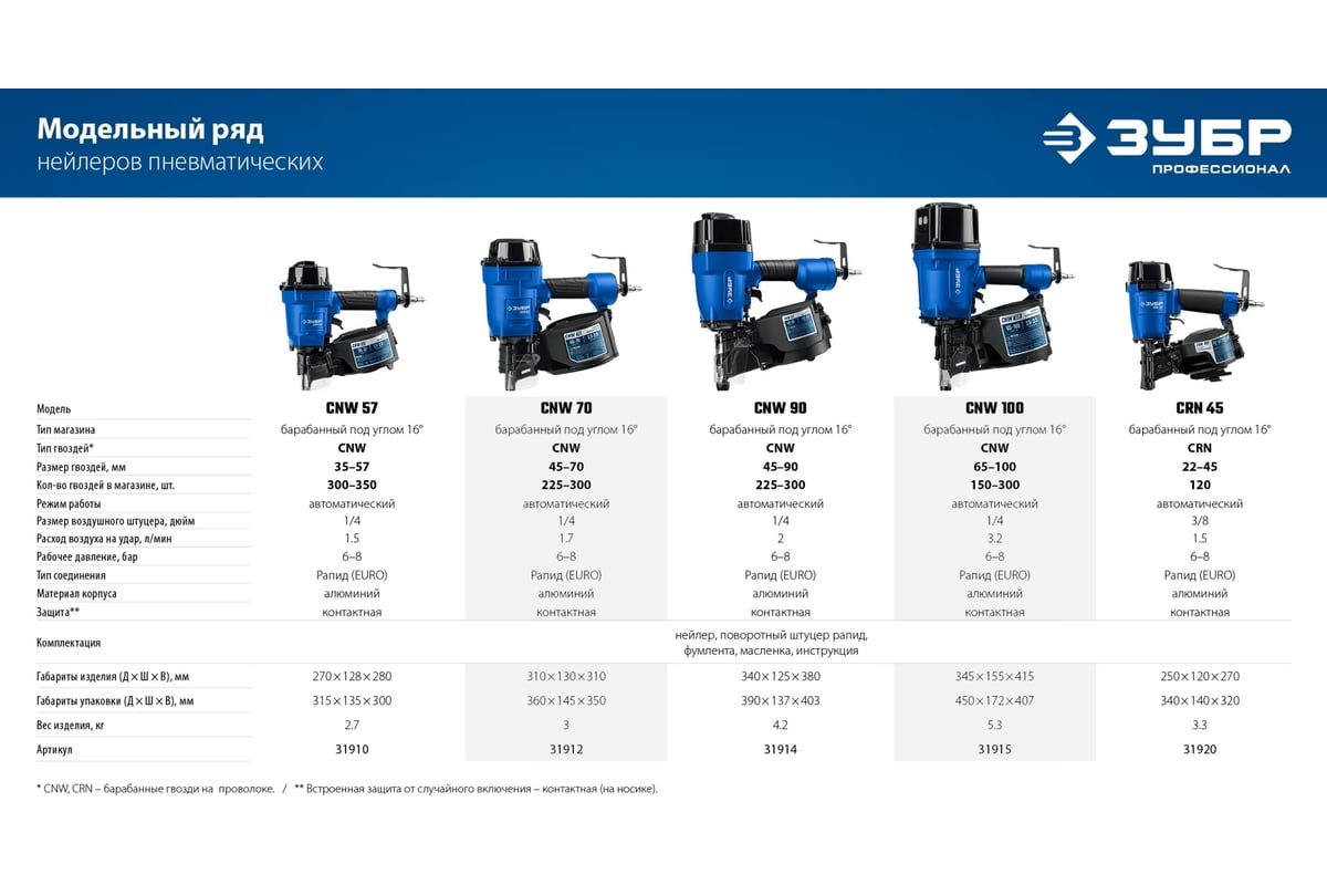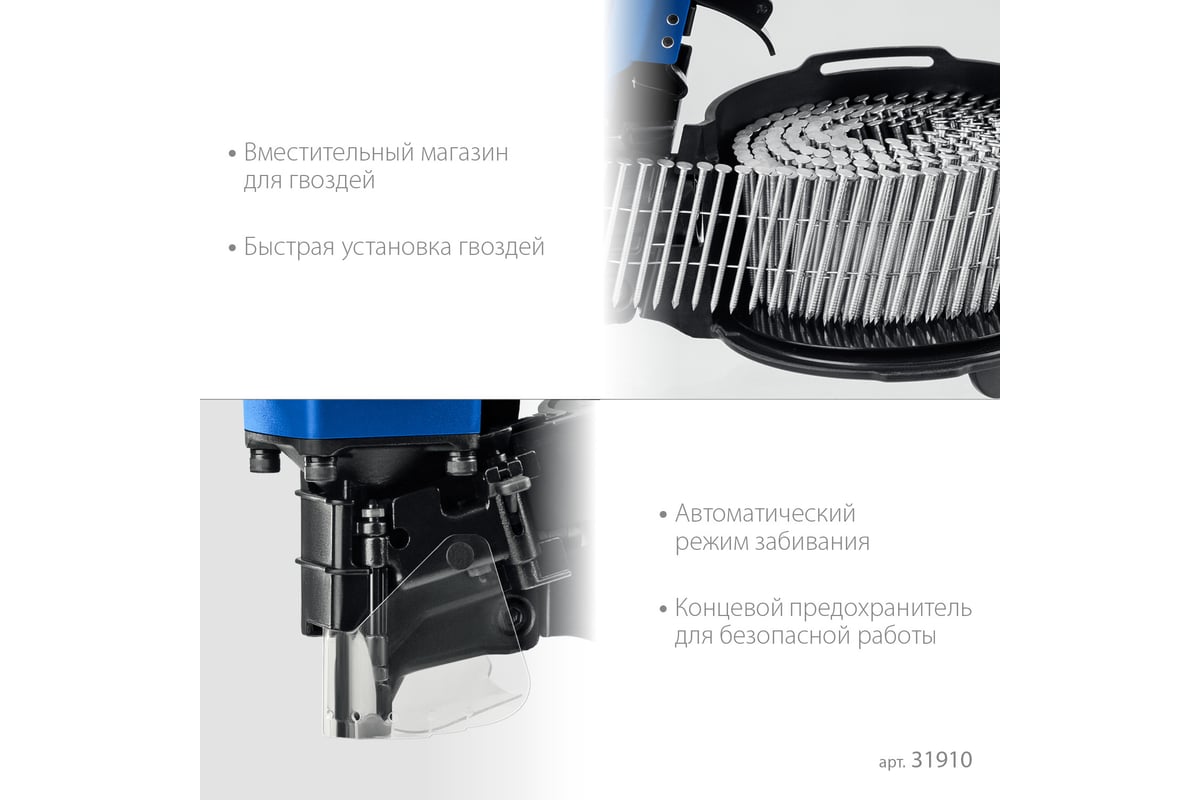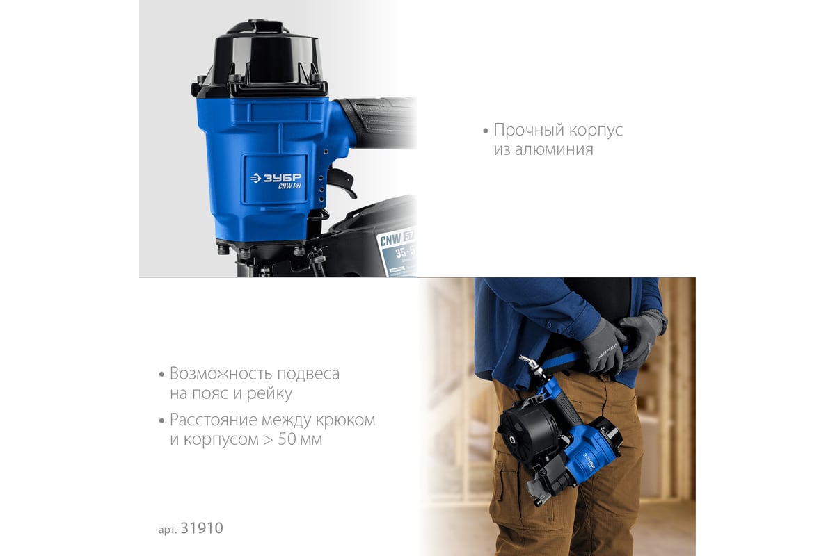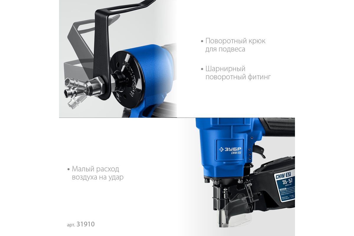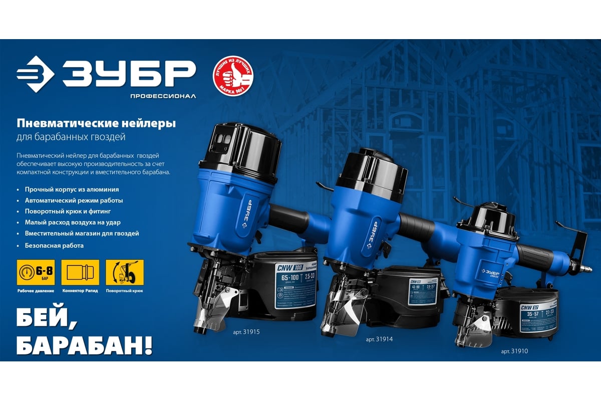 ЗУБР Профессионал CNW-57 Пневматический нейлер для барабанных гвоздей 31910 предназначен для производства паллет (поддонов) и других изделий из дерева, таких как тара, ящики и упаковка с гвоздями длиной 35-57 мм барабанного типа.