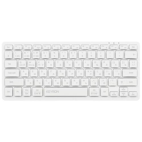 Клавиатура беспроводная KEYRON Grus – компактная модель с размерами корпуса 283x14x119 мм белого цвета. Устройство не требует подключения к USB-порту компьютера и работает полностью автономно благодаря встроенному аккумулятору. Для беспроводной связи с ПК или ноутбуком модель использует технологию Bluetooth или радиоканал. Благодаря использованию в качестве материала изготовления корпуса легкого пластика вес устройства не превышает 295 г.