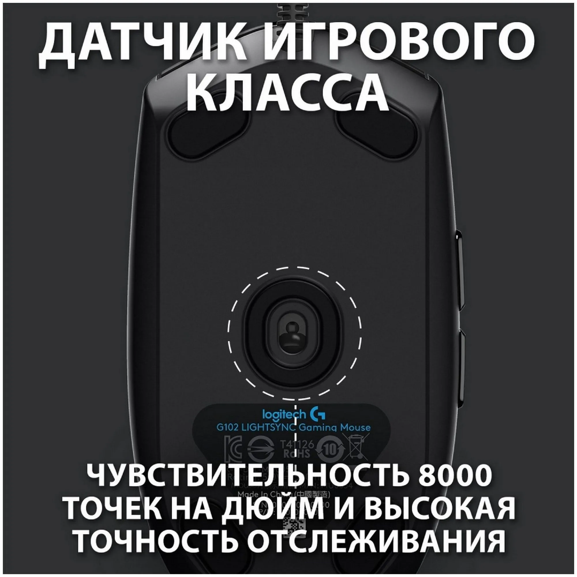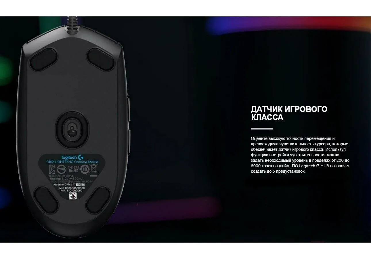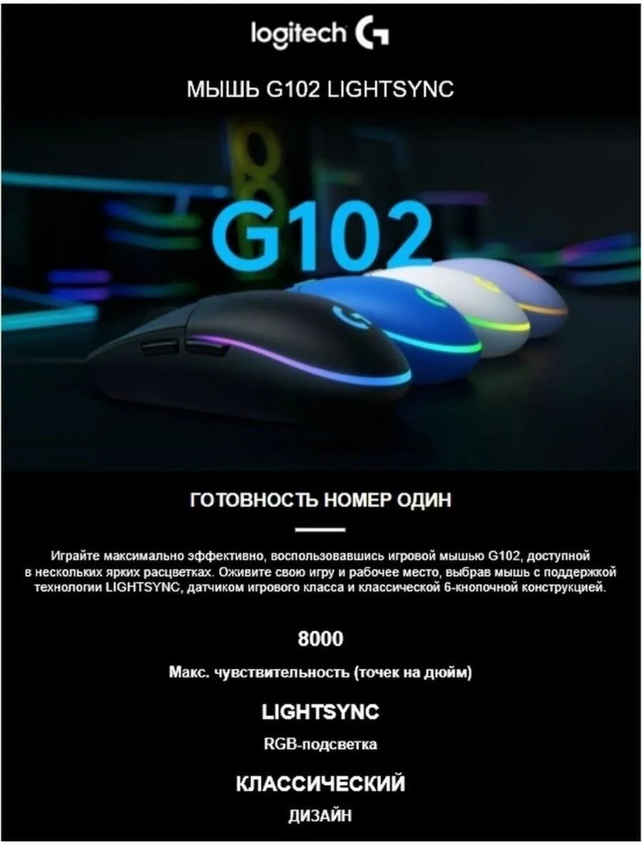 Проводная мышь Logitech 2-го поколения G102 Lightsync создана специально для геймеров, с сенсором 8000 точек на дюйм и яркой подсветкой Lightsync RGB. Датчики профессионального уровня мгновенно реагируют на Ваши движения с максимальной точностью, поэтому Вы можете играть с большей точностью, чем когда-либо. Настройте RGB с помощью холодных цветовых волн, используя более 16.8 миллионов цветов для создания радужных узоров и оптических эффектов. Программируемые кнопки сделаны с прочными металлическими пружинами, обеспечивающими каждый раз четкий щелчок. С Logitech G HUB Вы можете создавать собственные анимации, выбирать цвета и параметры отображения экрана. Вы также сможете отрегулировать настройки чувствительности, выбрав до 5 настроек DPI для наилучшего восприятия. Сенсор игрового уровня: играйте со сверхточным отслеживанием благодаря датчику 8000 точек на дюйм. Переключайтесь между 5 настройками чувствительности и отображением экрана с помощью G HUB. Lightsync RGB: благодаря 16.8 миллионами цветов вся радуга будет у Вас под рукой. Смешивайте цвета и играйте с оптическими световыми эффектами, которые подойдут под любое настроение. Проверенный игрой дизайн: простой дизайн с 6 кнопками дарит классическую игровую форму для полного контроля над игровым процессом. Упростите задачи с помощью программируемых кнопок. Клавиши с пружинным механизмом: механические кнопки с прочными металлическими пружинами. Четкие щелчки дают Вам точную обратную связь для повышения точности и ощущения. Пользовательские настройки: совместима с игровым программным обеспечением Logitech G Hub, теперь Вы можете менять настройки. Установите DPI от 200 до 8000 для большей точности для легких и быстрых игр. Объединяется с Logitech Gear: создавайте персональные игровые возможности с помощью этой проводной мыши для ноутбуков, Mac, ПК и компьютеров, которая совместима со всем оборудованием Logitech G.